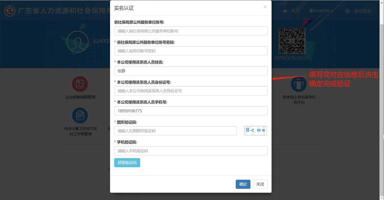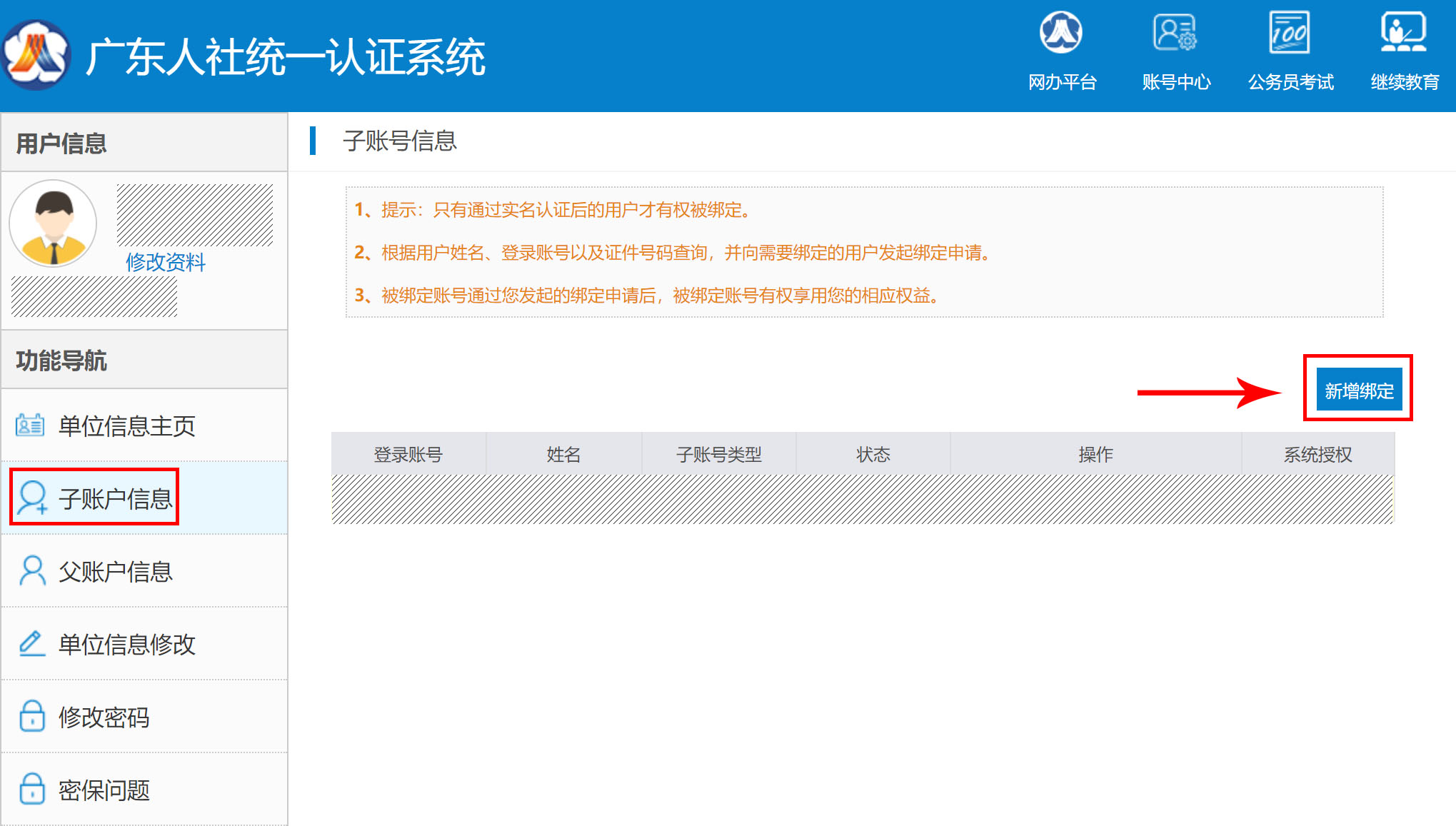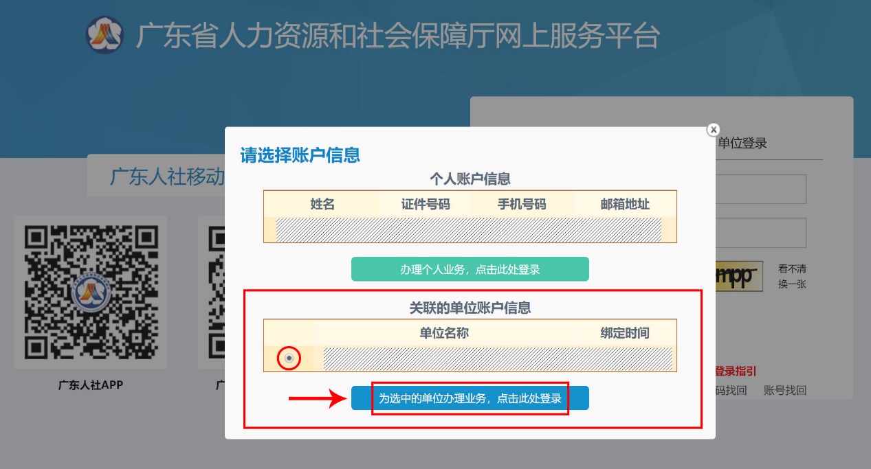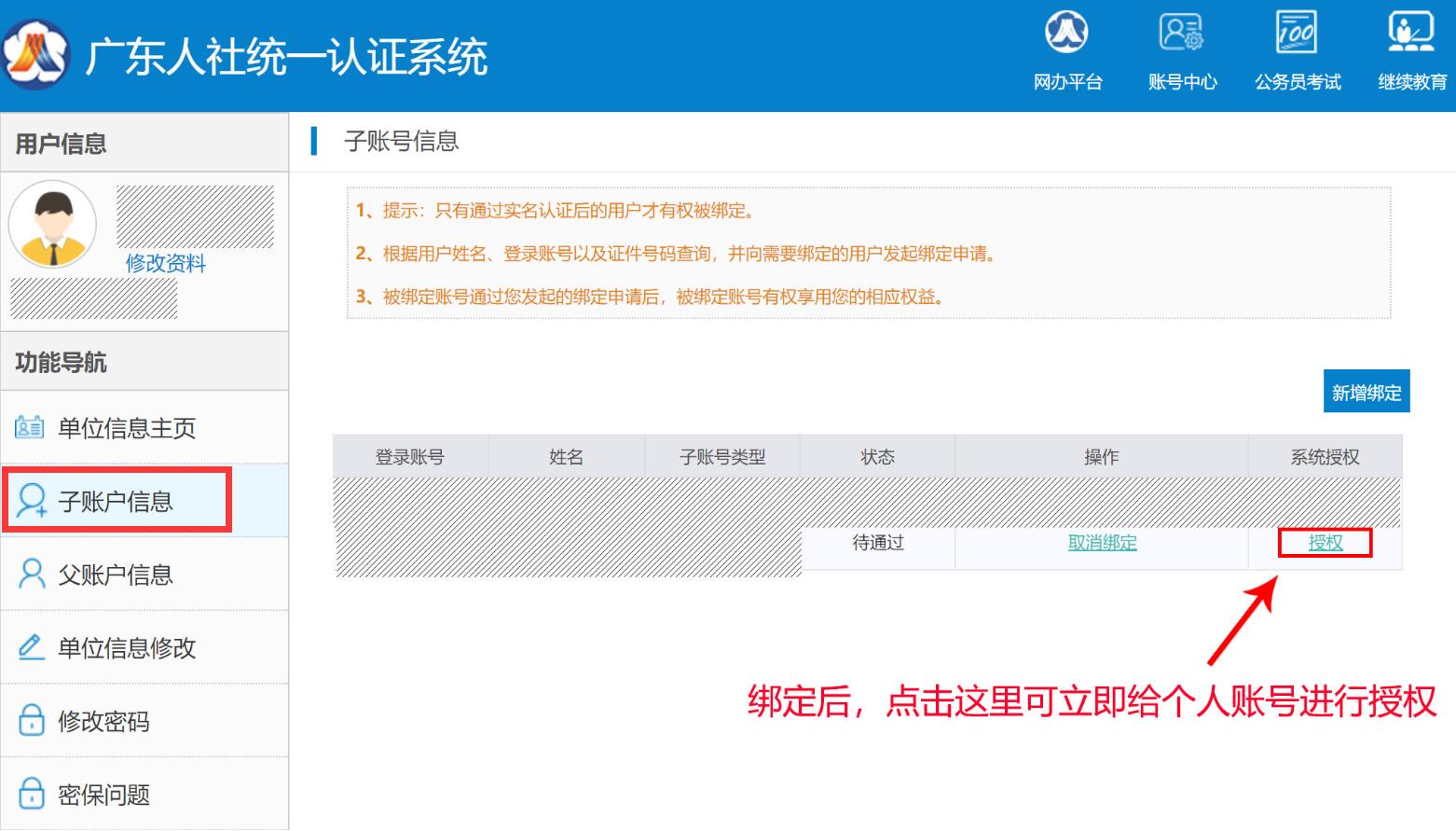 單位賬號綁定個人賬號并授權(如果找不到下述綁定頁面,請關閉當前所有瀏覽器,重新打開瀏覽器輸入地址:https://ggfw.gdhrss.gov.cn/auth再用單位賬號登錄即可)