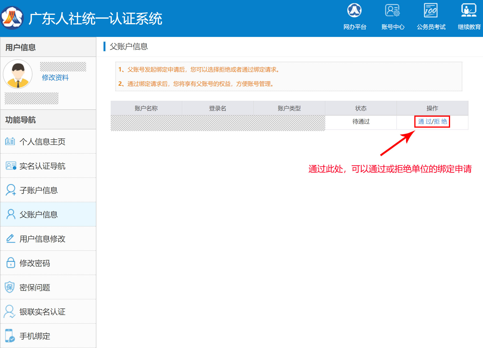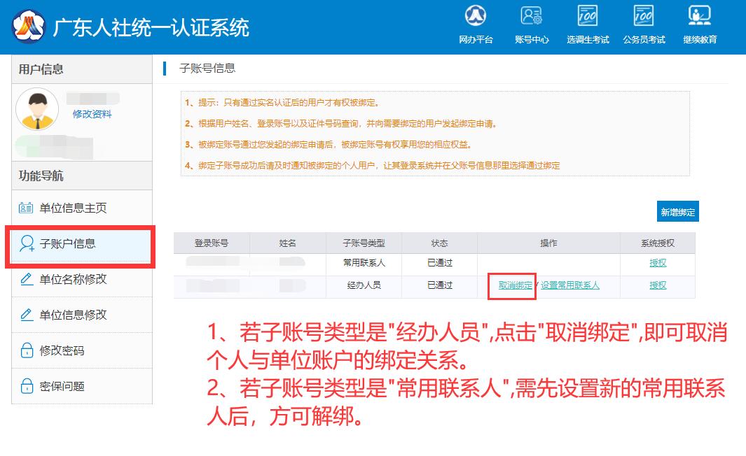 5.單位用戶可以在“子賬戶信息”處解綁單位經辦用戶;個人用戶可以在“父賬戶信息”處解綁本人的單位經辦用戶角色。