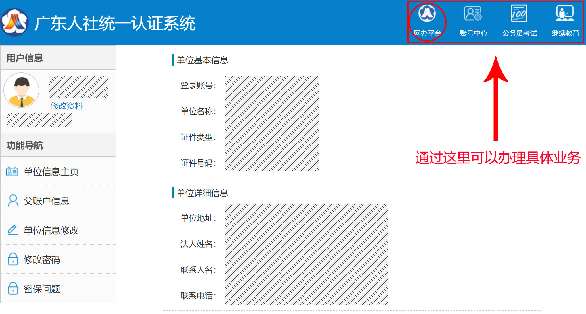 從以下圖中所示位置進入即可為單位辦理業務。公務員考錄、繼續教育業務可以直接點擊對應圖標進入,其他業務請點擊"網辦平臺"進入。(也可從具體的業務系統入口進入,按照上述方式登錄后為單位辦理業務,具體以業務系統指引為準)