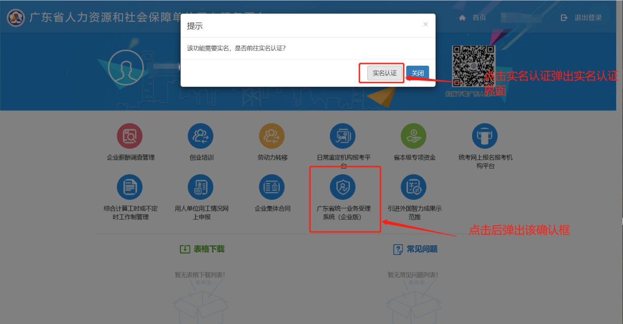 當單位經辦人員選中單位登錄網辦系統后,若檢查到該單位未完成實名認證,系統會提示單位經辦人員需要實名認證。