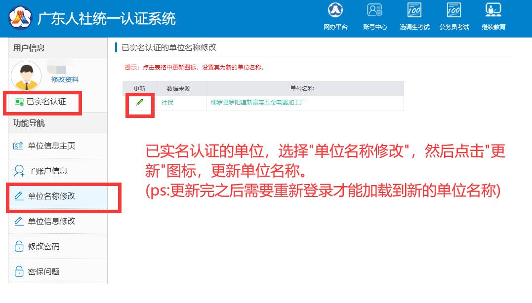 單位實名認證后,用單位賬號登錄可以對單位名稱進行修改。