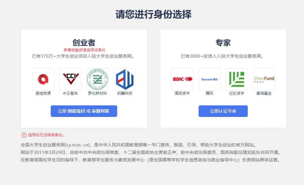 注冊成功后可進行身份選擇:創(chuàng)業(yè)者(點擊“立即創(chuàng)建項目”,參賽請選擇該身份)或專家(點擊“立即認證專家”)。