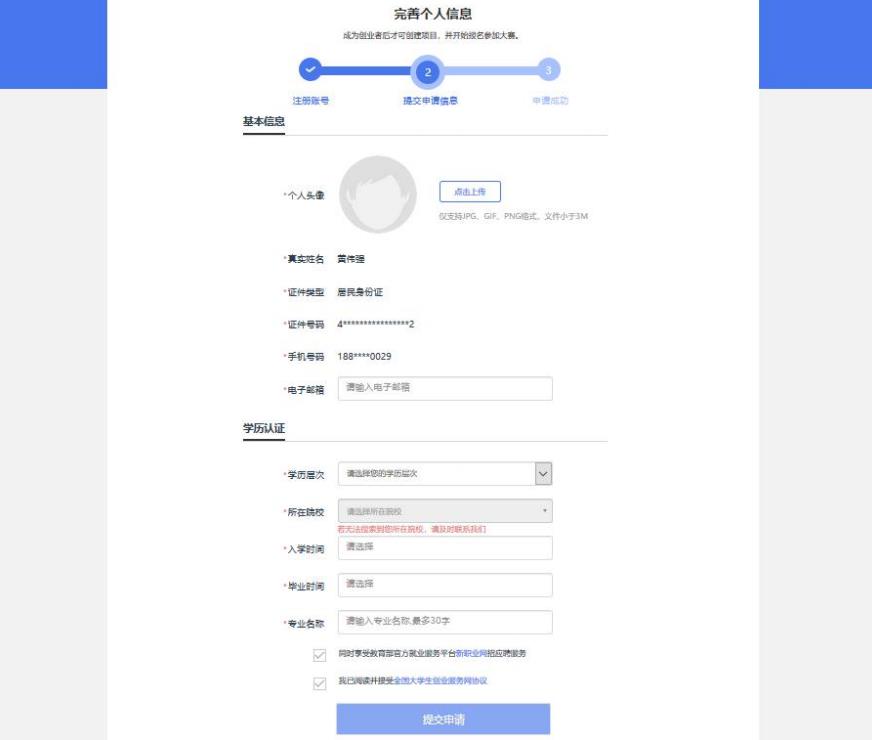 選擇“創(chuàng)業(yè)者”身份,點擊“立即創(chuàng)建項目”后,需完善個人信息并進行學籍學歷信息驗證(提交申請后,個人中心顯示“學籍校驗未通過”則無法進行報名參賽、報名“青年紅色筑夢之旅”活動等其他操作)。填寫的相關信息如上所示,包括:個人頭像、電子郵箱、學歷層次、所在院校、入學時間及畢業(yè)時間、專業(yè)名稱。若無法搜索到您所在院校,請聯系所在院校負責大賽的老師,由所在院校聯系省級負責人,并由省級負責人統一聯系大賽組委會,由大賽組委會統一處理。