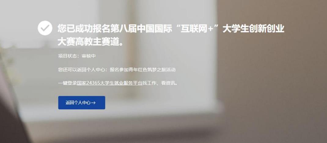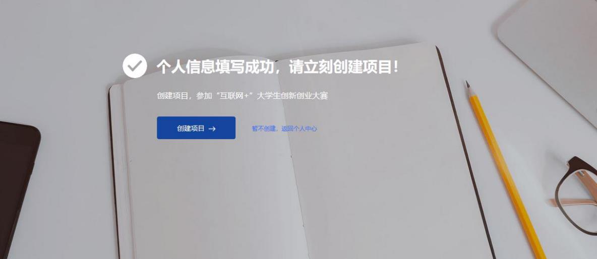 個人信息填寫成功后,可點擊“創(chuàng)建項目”,進行項目的創(chuàng)建、報名參賽等操作,也可選擇暫不創(chuàng)建,返回個人中心。