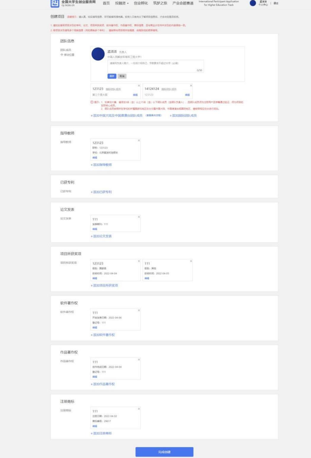 如不填寫直接點擊“完成創(chuàng)建”即可創(chuàng)建成功創(chuàng)業(yè)項目。