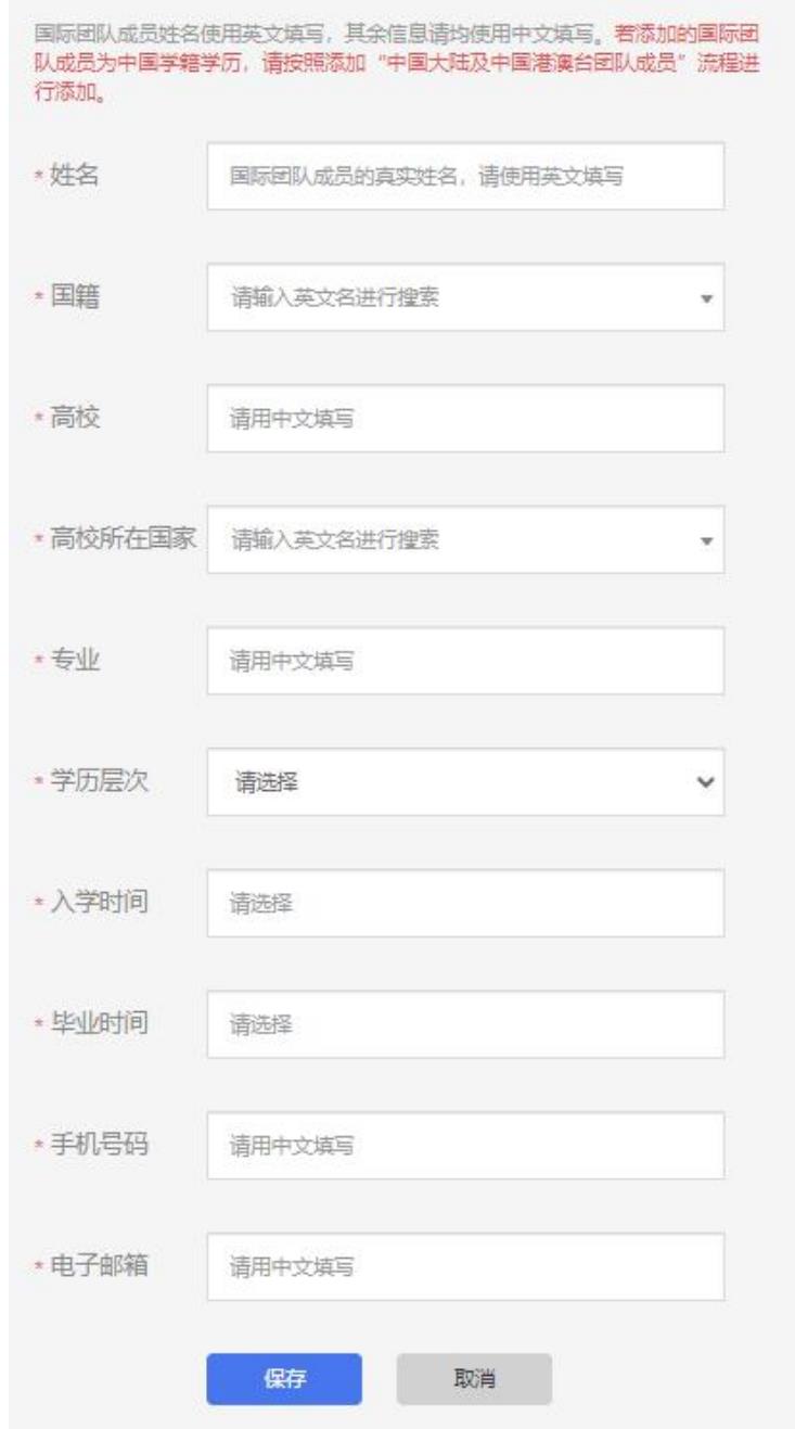 請按照國際團隊成員所在院校的所屬國家添加相應信息,包括姓名(英文填寫)、國籍、高校、高校所在國家、專業(yè)、學歷層次、入學時間、畢業(yè)時間、手機號、電子郵箱。