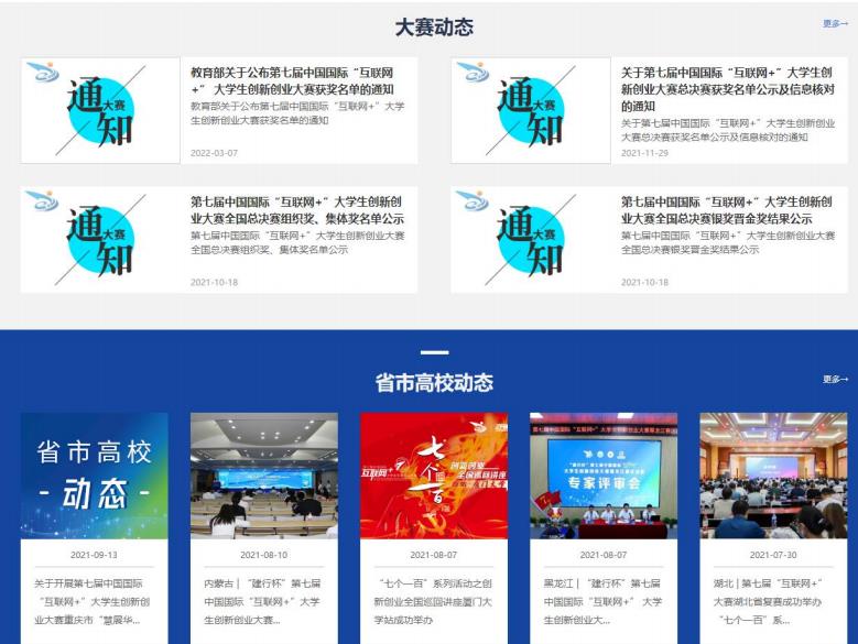 第二屏為大賽動態(tài)、省市高校動態(tài),這里將及時發(fā)布關于大賽的重要通知、新聞、活動以及各省市、高校大賽組織的動態(tài)新聞等,點擊“更多”之后進入大賽動態(tài)、省市高校動態(tài)詳情頁。