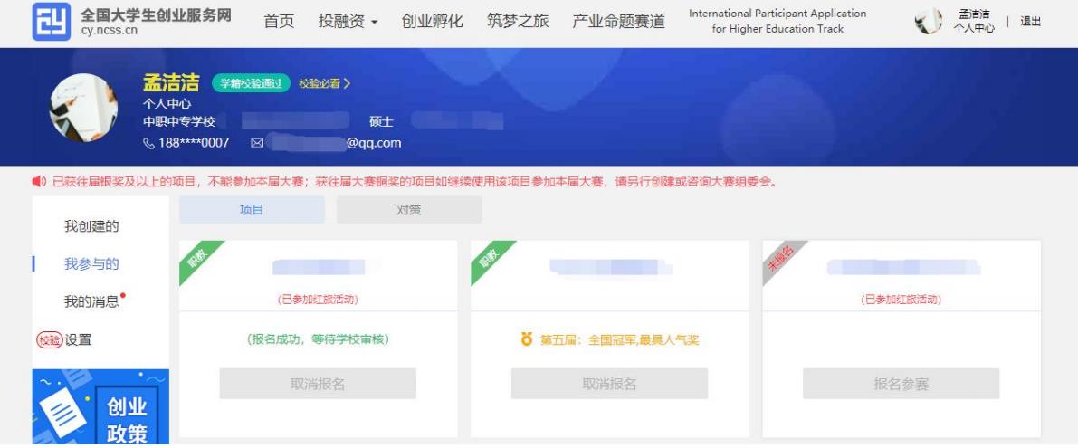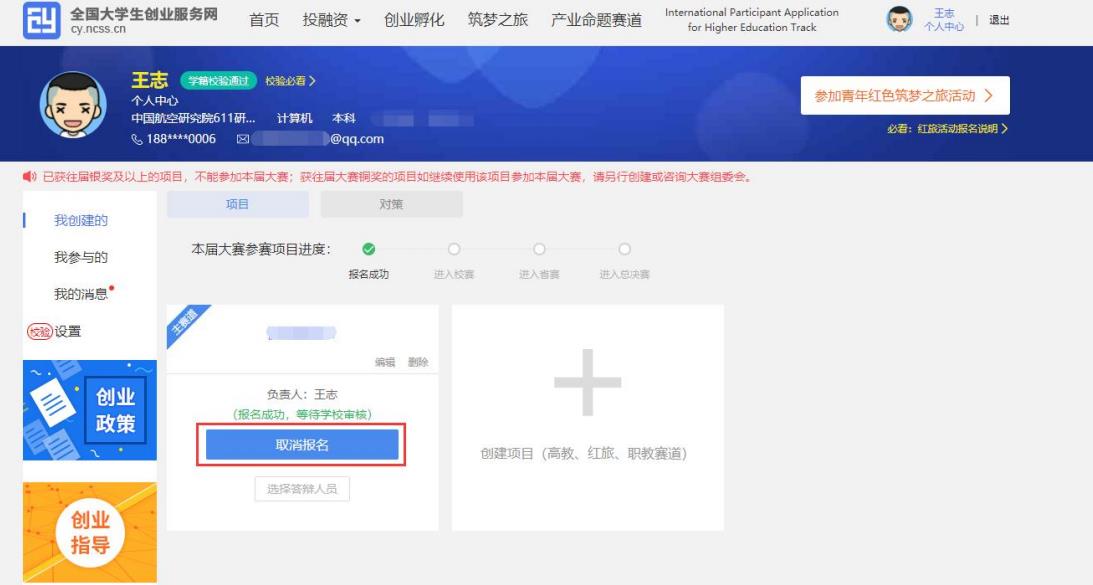 報名參賽后,如需更改項目的參賽信息(參賽賽道、參賽組別、參賽類別),請進入個人中心的“我創(chuàng)建的”—“項目”中點擊該項目標簽中的“取消報名”(如上圖)后,重新報名參賽。請注意,已報名參賽項目可能已經通過校級、省級審核,所以請在“取消報名”前,聯系所在院校及省市,以免影響項目參賽。