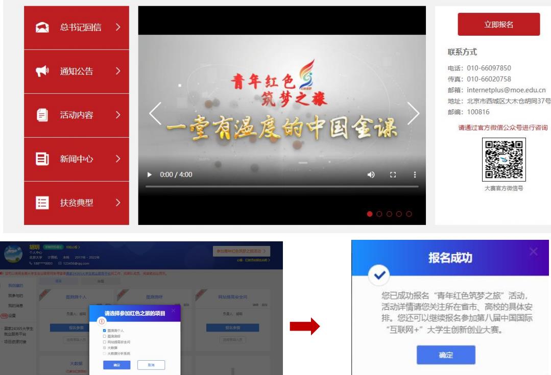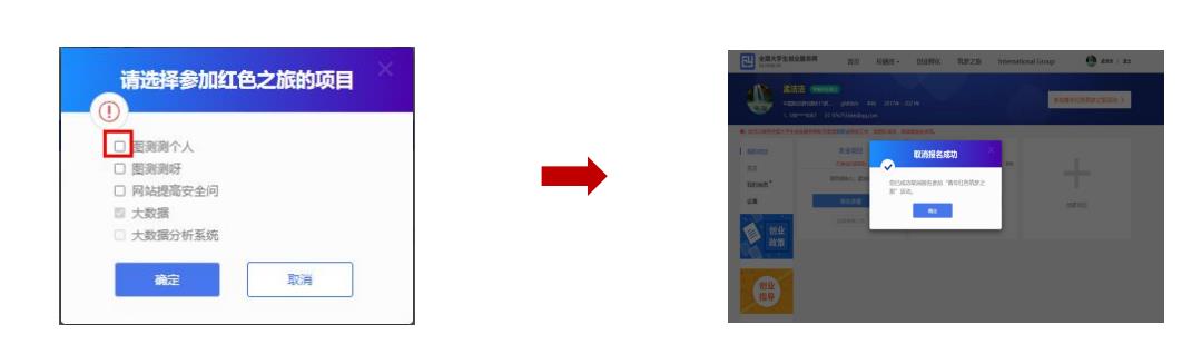通過首頁導航鍵“筑夢之旅”進入報名頁面或進入個人中心點擊“參加青年紅色筑夢之旅活動”報名紅旅活動,并點擊“立即報名”報名紅旅活動。勾選相應項目,點擊確定后即完成“青年紅色筑夢之旅”報名?;顒釉斍檎堦P注所在省市、院校的具體安排。若需取消報名參加“青年紅色筑夢之旅”活動,如下圖,再次點擊“參加青年紅色筑夢之旅”活動,勾除該項并點擊確定后即可取消報名。在全國大學生創(chuàng)業(yè)服務網上創(chuàng)建的項目(除產業(yè)命題賽道),均可報名參加“青年紅色筑夢之旅”活動。