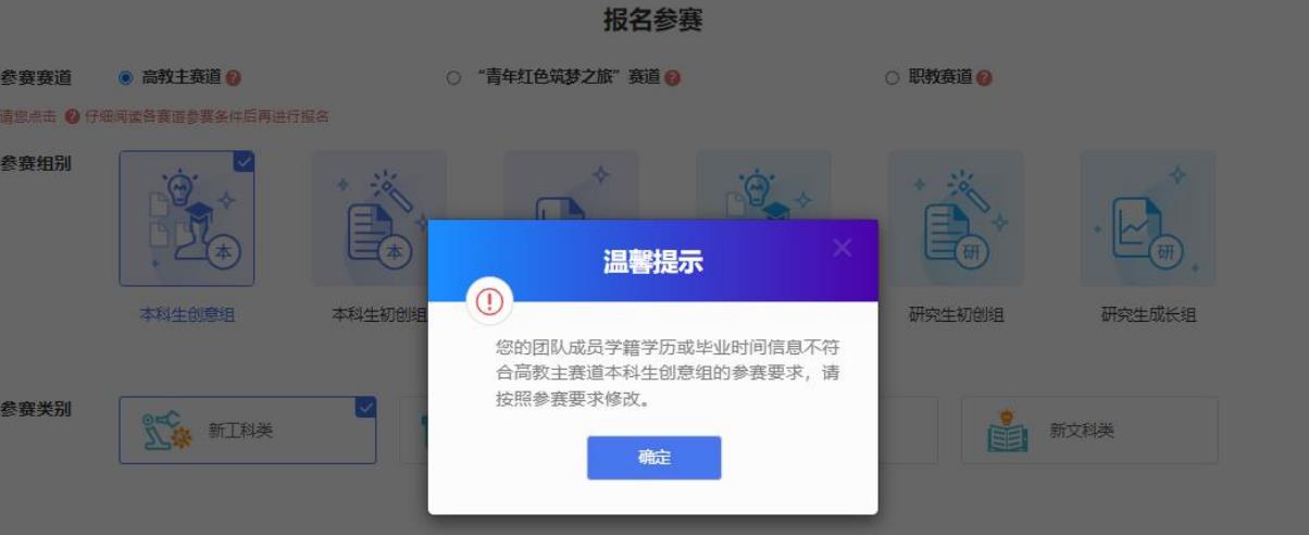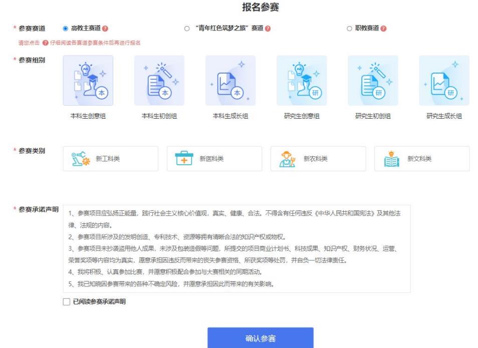 完成項目的創(chuàng)建后即可報名參賽,需選擇參賽賽道、參賽組別及參賽類別,如下圖,選擇完成后點擊“確認參賽”即可進入參賽的審核環(huán)節(jié)(項目報名完成后,由團隊負責人所在院校進行審核)。請注意:1.填寫報名參賽信息后,如該項目不符合所報賽道及組別的相應要求,則無法提交參賽,系統會對項目不符合要求的信息進行提示。請按照參賽要求重新填寫或更換其他賽道、組別。2.選擇“青年紅色筑夢之旅”賽道的項目需已報名參加“青年紅色筑夢之旅”活動。