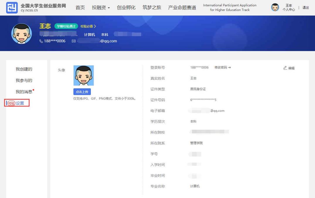個人中心的“設置”版塊可修改個人頭像、密碼。其他個人信息修改時需同時通過學籍學歷驗證方可修改。一旦項目報名參賽,個人信息不可修改,如需修改請點擊“取消報名”操作或刪除項目。注意:完善個人信息時若未通過學籍學歷校驗(個人中心左上角出現紅底白字“學籍校驗不通過”字樣),請點擊“校驗必看”查看學籍校驗不通過處理辦法,然后點擊“設置”,重新填寫學籍學歷信息提交校驗(填寫信息需與學信檔案信息保持一致方可通過驗證)。