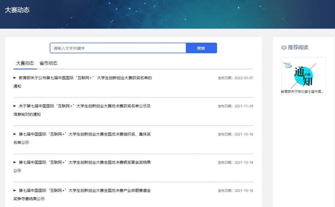 該頁為大賽動態(tài)、省市高校動態(tài)的列表頁,頂部是動態(tài)搜索欄,大賽動態(tài)和省市高校動態(tài)可在該列表進行切換,右側為與大賽相關的推薦閱讀,點擊列表中的文章后進入該文的詳情頁。