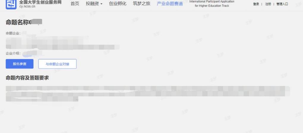 “產業(yè)命題賽道”頁點擊“立即報名”,該頁展示所有發(fā)布的企業(yè)命題,可通過右上角輸入“命題企業(yè)名稱”及“命題名稱”進行搜索。點擊命題進入命題詳情頁查看具體詳情信息,如下圖。