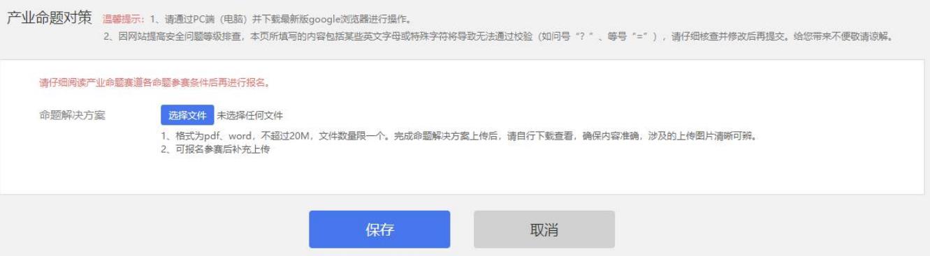 登錄后將跳轉至“命題解決方案”填寫頁,完成上傳后點擊“保存”提交;或直接點擊“保存”跳過此項,進入下一步。
