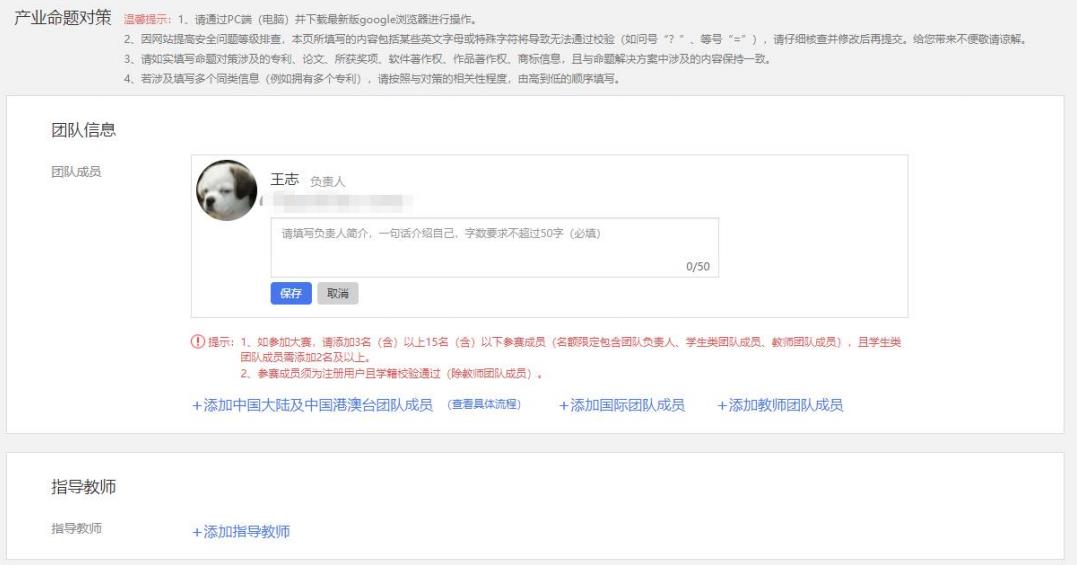 請注意:如參加大賽,請?zhí)砑?3 名(含)以上 15 名(含)以下參賽成員(名額限定包含團隊負責人、學生類團隊成員、