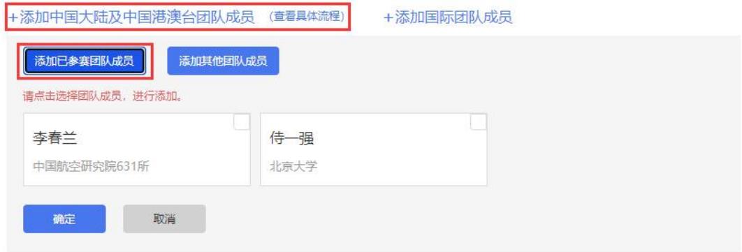 “添加中國大陸及港澳臺地區(qū)的團隊成員”操作時,若已添加項目并報名其他賽道,可點擊“添加已參賽團隊成員”后勾選已參賽的團隊成員直接進行邀請。