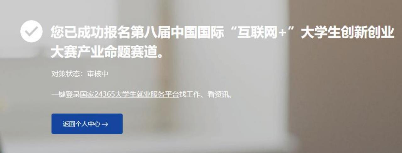 報名成功后,項目即進入“等待學校審核”狀態(tài),如有疑問,請聯系學校跟進審核情況,避免影響參賽??稍趥€人中心“本屆大賽參賽項目進度”處查看項目狀態(tài)(見下圖)。