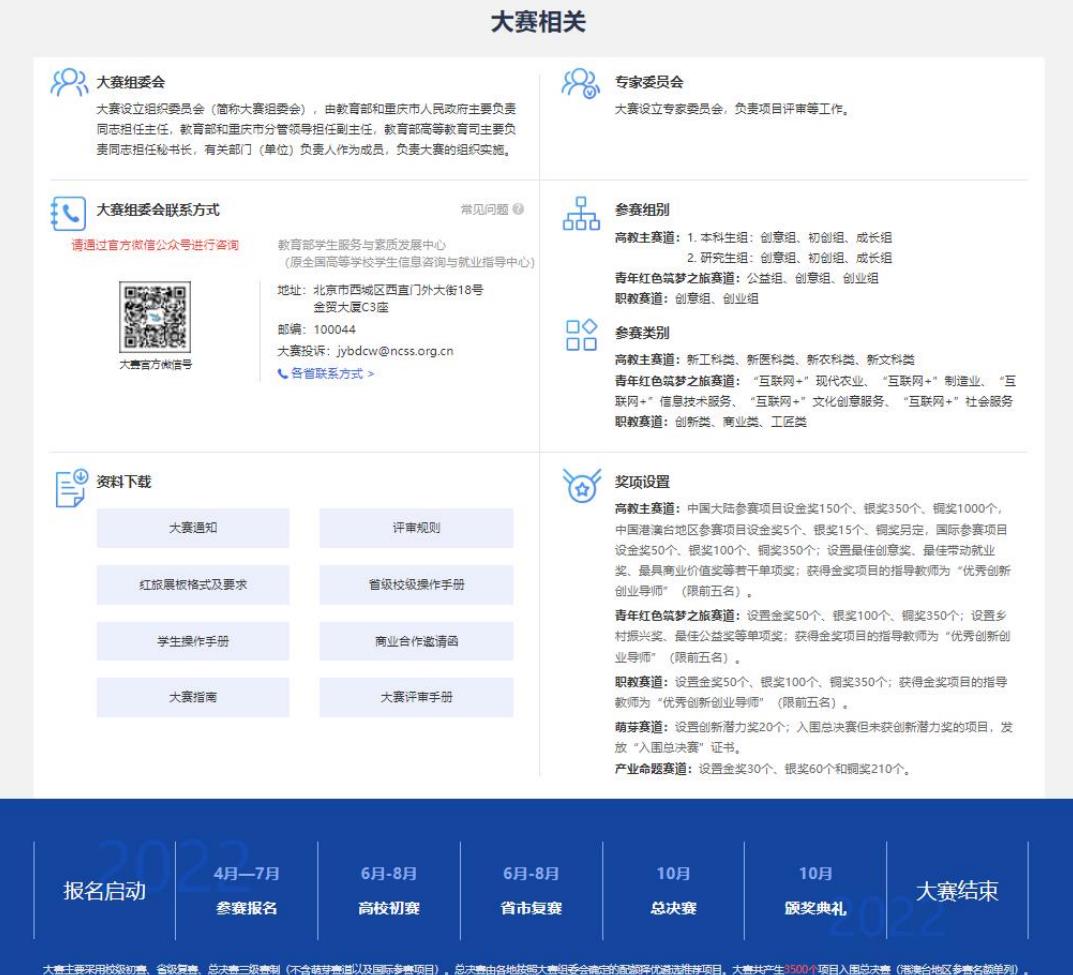 第三屏為大賽的重要信息頁,包括大賽進程時間安排、獎項設置、參賽組別、參賽類別、大賽組委會聯系方式(賽事問題請通過大賽官方微信公眾號進行咨詢)以及大賽相關文檔資料的下載等,并且提供常見問題解答的鏈接及大賽各省市聯系方式(報名參賽前請仔細閱讀常見問題。總決賽階段前,參賽團隊如有賽事相關問題,請咨詢所在院校大賽負責人或點擊各省聯系方式,電話咨詢所在省市)。