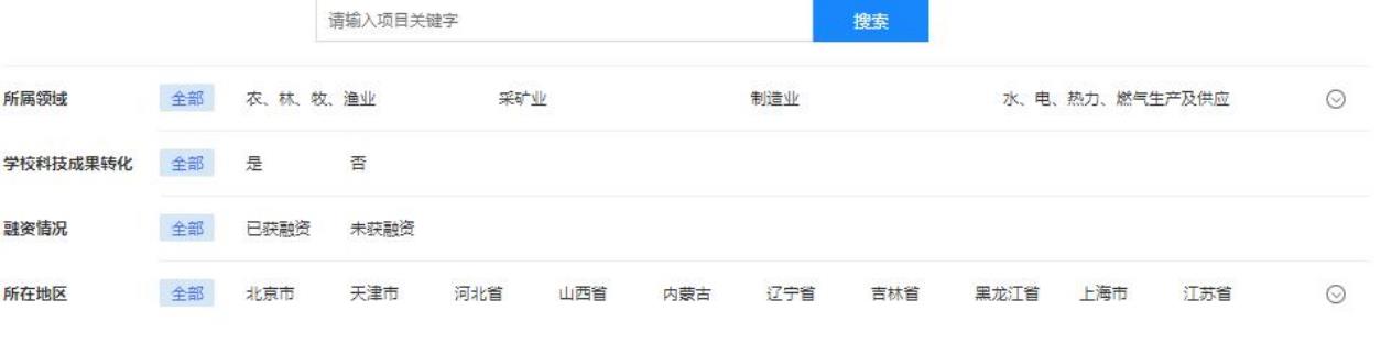 該頁展示在本站創(chuàng)建項目并通過審核的創(chuàng)業(yè)項目,設置有搜索框、選擇篩選項兩種方式進行篩選需要查找的項目。篩選項包括以下內容:所屬領域、學??萍汲晒D化情況、融資階段、所在地區(qū)(地區(qū)為省份級別)。點擊項目列表中某個項目則跳轉進入查看項目詳情(注冊成為創(chuàng)業(yè)者或專家方可查看)。