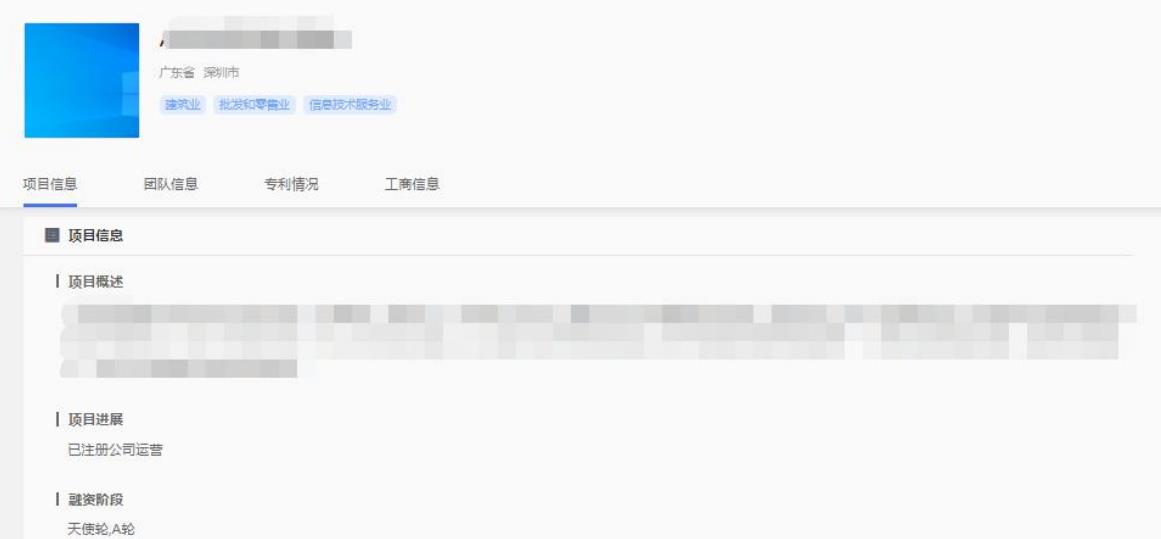 項目詳情頁根據不同的用戶身份角色查看的內容有所不同,角色分別設置有:創(chuàng)業(yè)者、專家。不同角色將瀏覽到不同內容的項目信息。創(chuàng)業(yè)者僅可查看到項目基本信息(項目概述、項目進展、融資階段);針對專家,若您的項目隱私設置為保密,則專家僅可查看到項目基本信息(項目概述、項目進展、融資階段),若您的項目隱私設置為公開,則專家可查看到項目概述、項目進展、團隊成員(基本信息)、融資情況、工商注冊等部分信息。