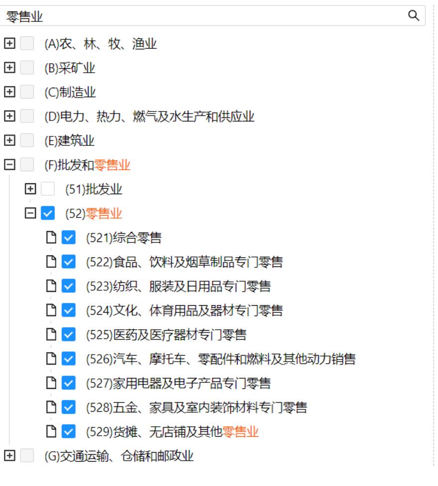 在系統(tǒng)中,除了使用關(guān)鍵詞進(jìn)行查詢外,我們還可以通過國(guó)民經(jīng)濟(jì)行業(yè)分類樹來對(duì)經(jīng)營(yíng)范圍條目的篩選。
