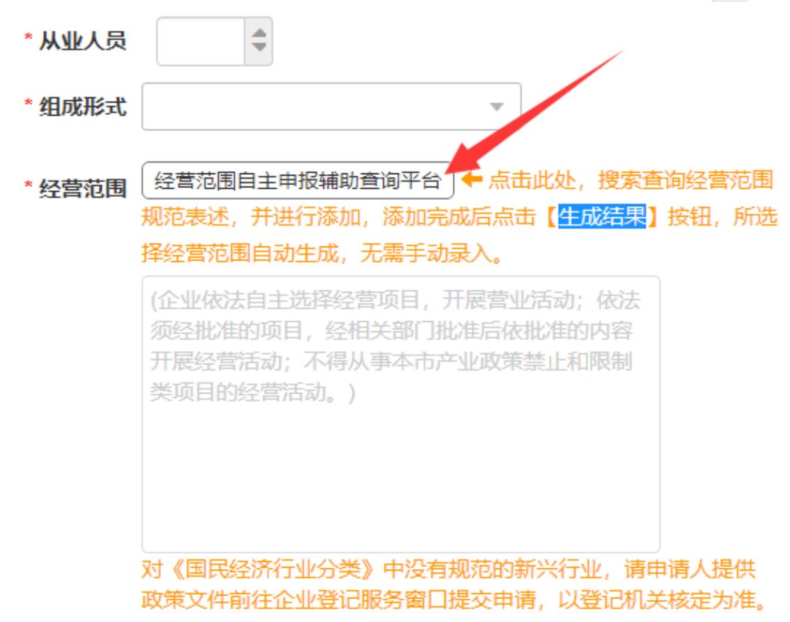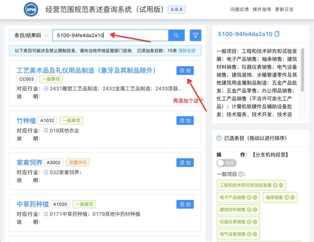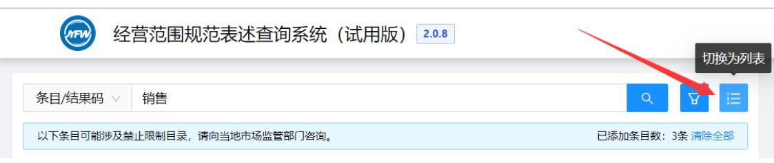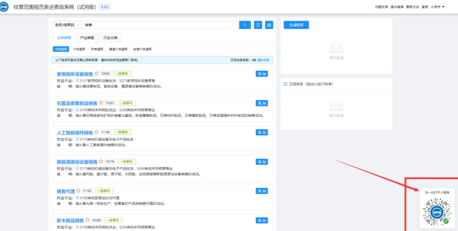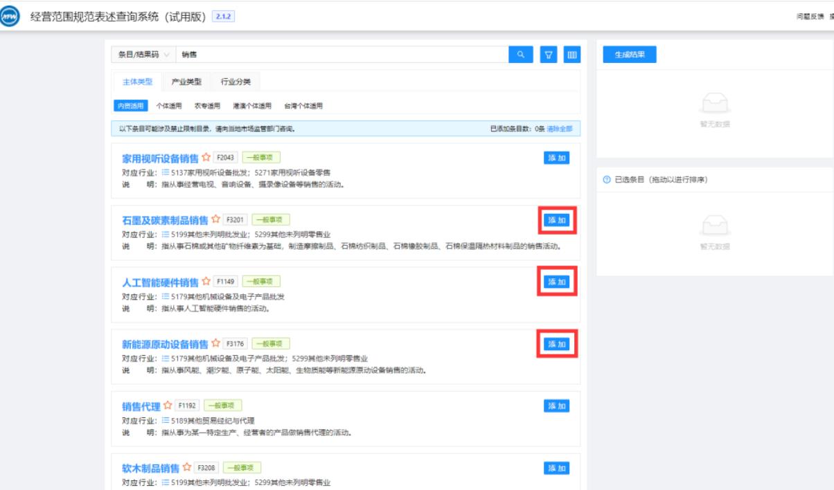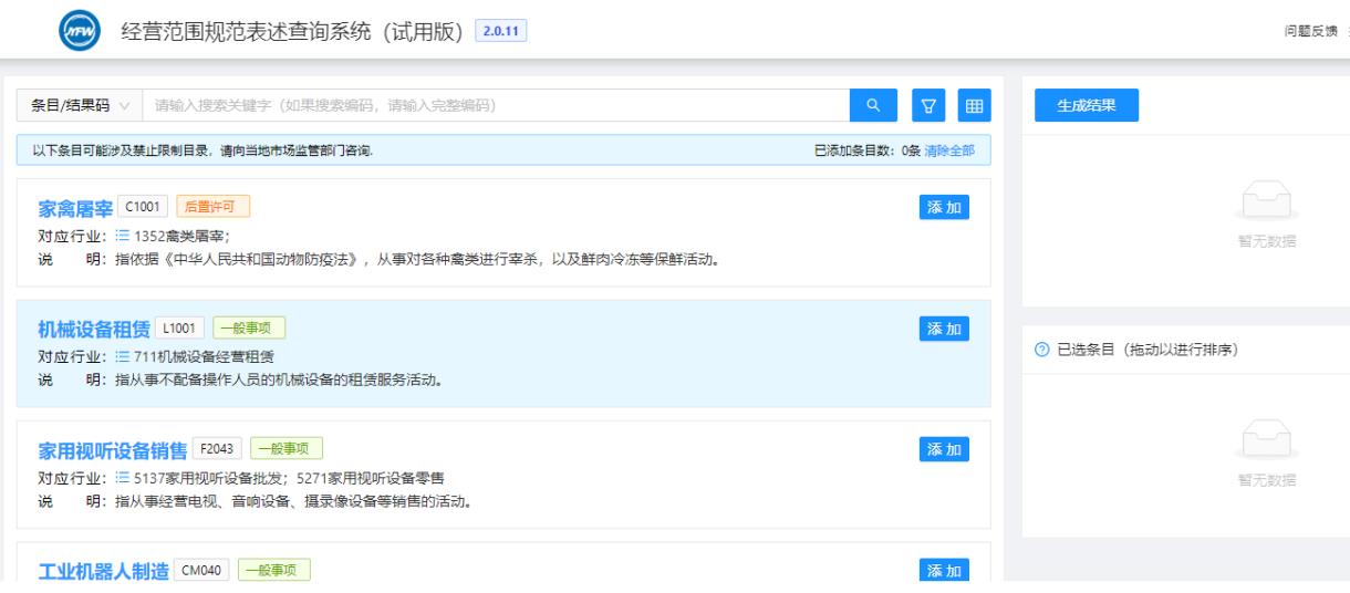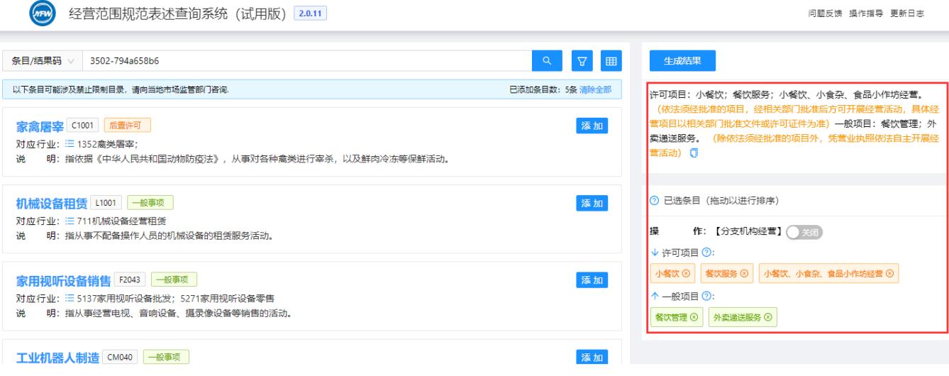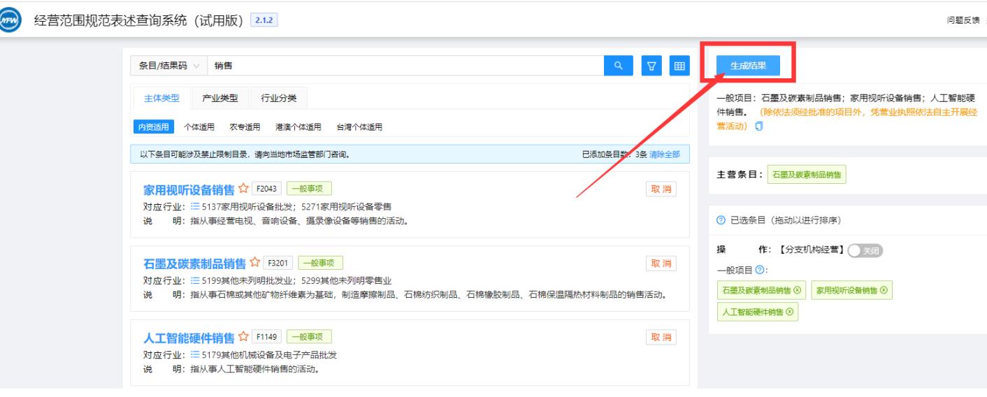 隨后可以繼續(xù)進(jìn)行條目的搜索添加或直接點(diǎn)擊《生成結(jié)果》按鈕完成經(jīng)營(yíng)范圍的選擇。