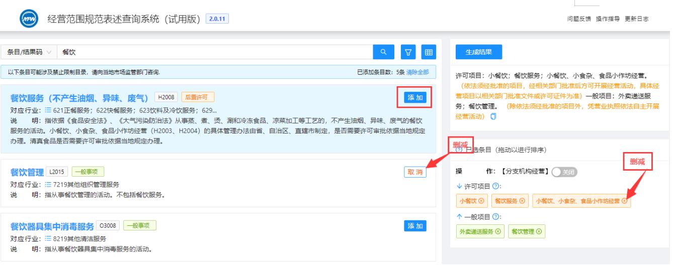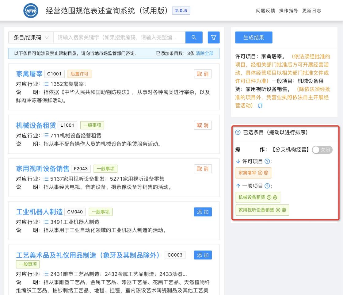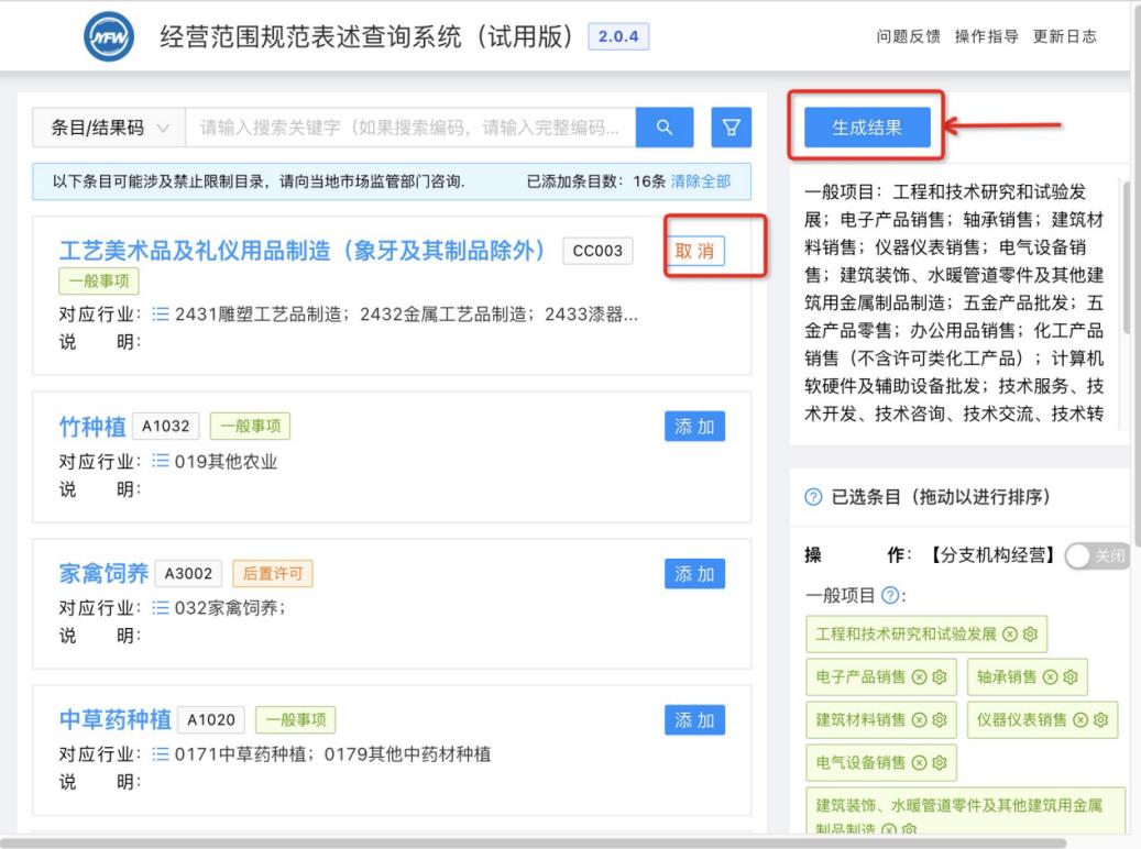 隨后可以繼續(xù)進(jìn)行條目的搜索添加、刪減或直接點(diǎn)擊《生成結(jié)果》按鈕完成經(jīng)營(yíng)范圍的選擇。