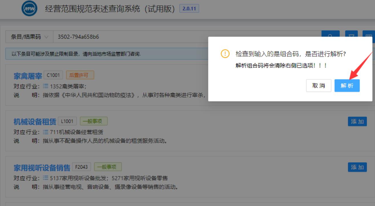 點(diǎn)擊解析后,組合碼中的所存儲(chǔ)的經(jīng)營(yíng)范圍就會(huì)再右側(cè)已選擇條目中出現(xiàn):
