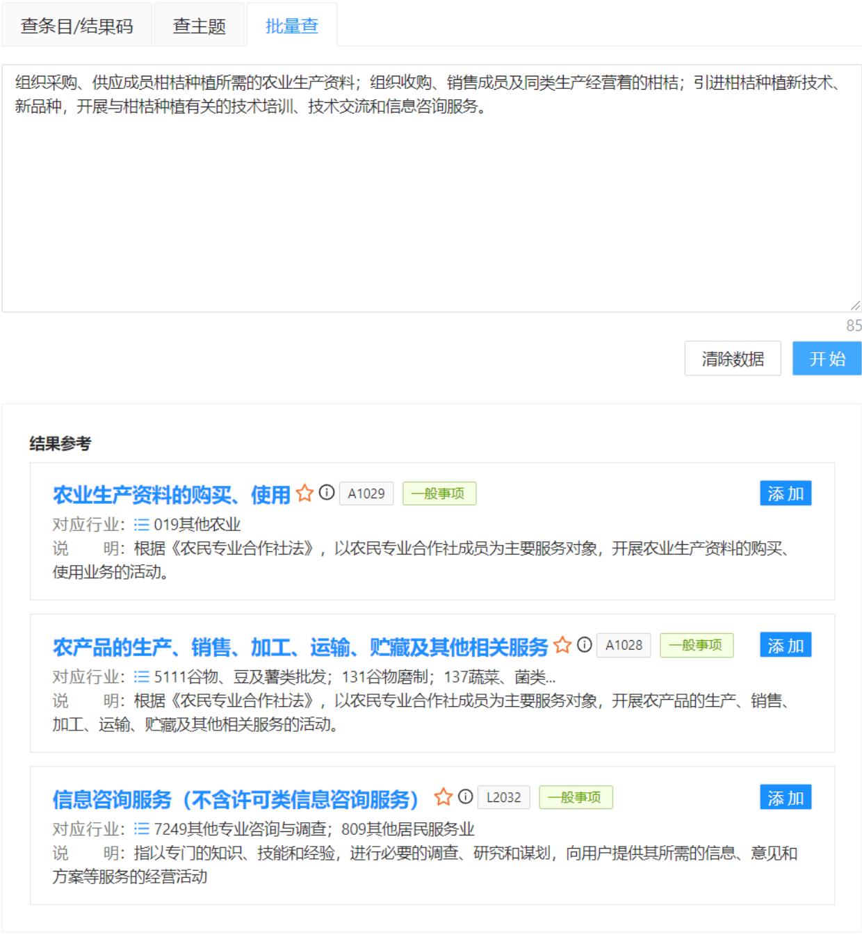 如下圖示例,我們上線了對(duì)文本的解析查詢功能,您可以對(duì)純經(jīng)營(yíng)范圍的內(nèi)容進(jìn)行操作,系統(tǒng)會(huì)對(duì)這段內(nèi)容進(jìn)行轉(zhuǎn)換分析,得到對(duì)應(yīng)的條目信息。(單段文本內(nèi)容盡量不要超過1000字)
