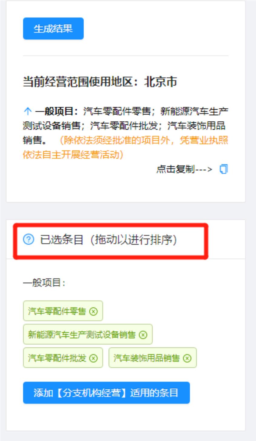 同時(shí)對(duì)于已選擇了的經(jīng)營(yíng)范圍,我們用鼠標(biāo)對(duì)經(jīng)營(yíng)范圍條目進(jìn)行拖動(dòng)排序。