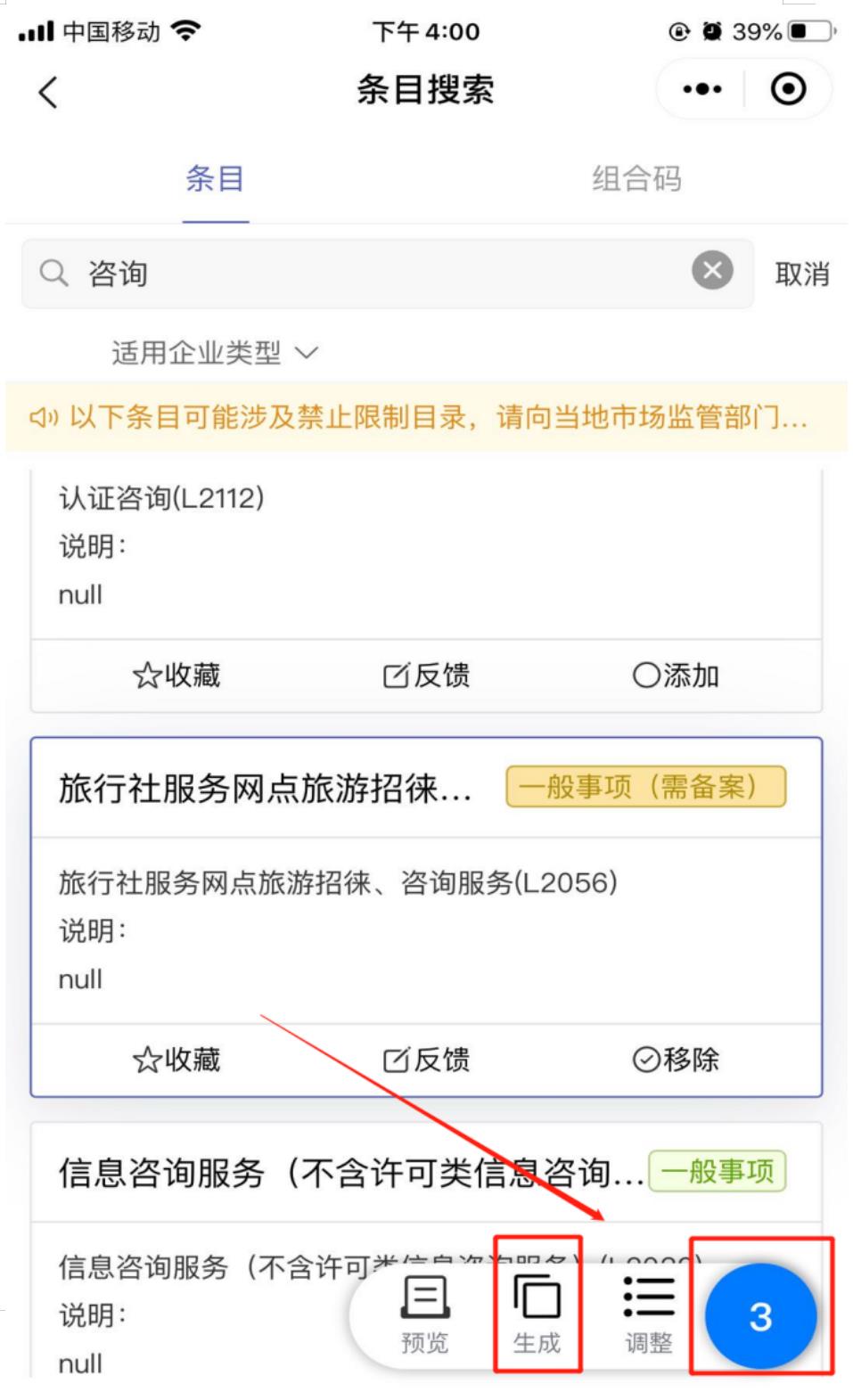 在(手機(jī)端)查詢系統(tǒng)選擇好經(jīng)營(yíng)范圍后, 點(diǎn)擊屏幕右下角藍(lán)色圓圈,然后點(diǎn)擊“生成”選項(xiàng),可生成已選經(jīng)營(yíng)范圍的專用組合碼;