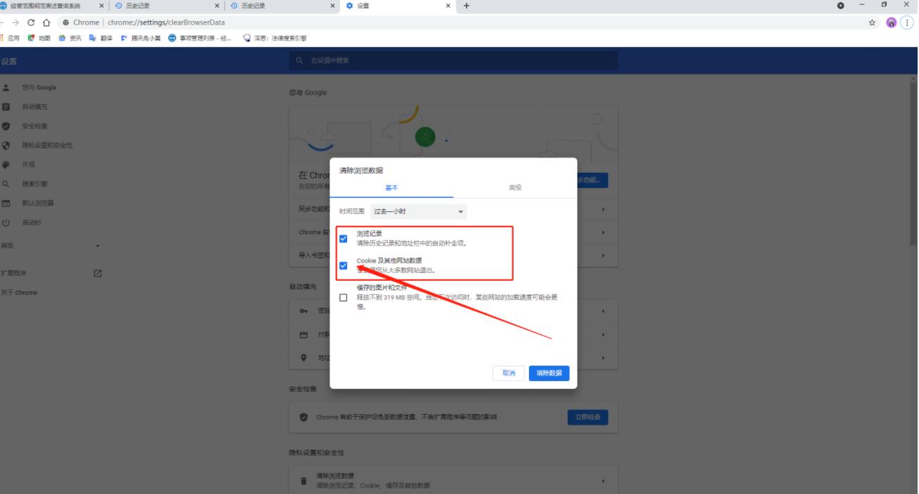 3、選擇瀏覽記錄;Cookie及其他網(wǎng)站數(shù)據(jù),然后點(diǎn)擊“清除數(shù)據(jù)”,清除完成后,關(guān)閉瀏覽器,再重新打開瀏覽器即可。
