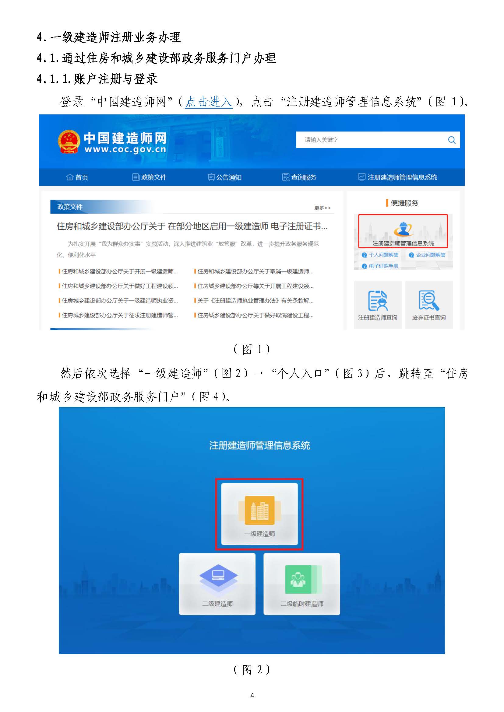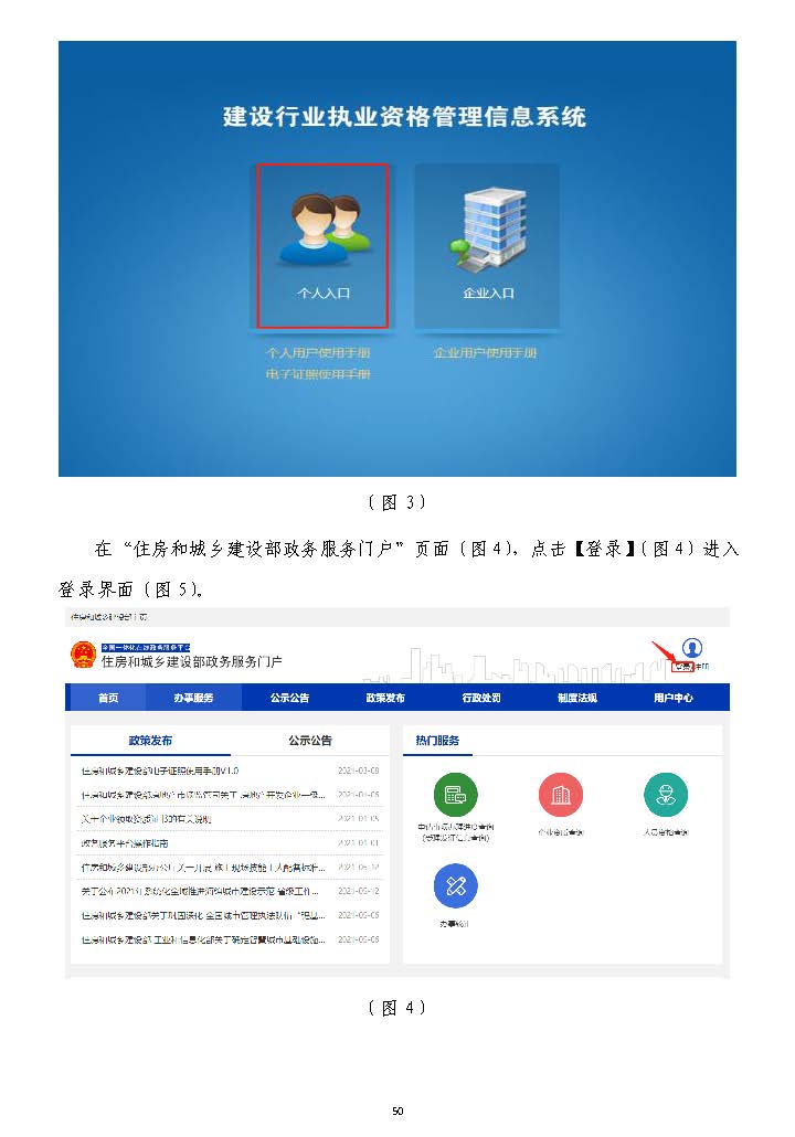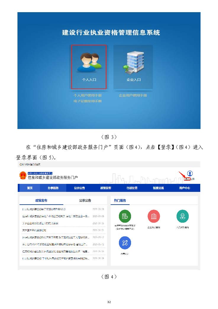 然后依次選擇“一級建造師”(圖22)→“個人入口”(圖)→“個人入口”(圖33)后,跳轉至“住房)后,跳轉至“住房和城鄉(xiāng)建設部政務服務門戶”(圖和城鄉(xiāng)建設部政務服務門戶”(圖44)。)。