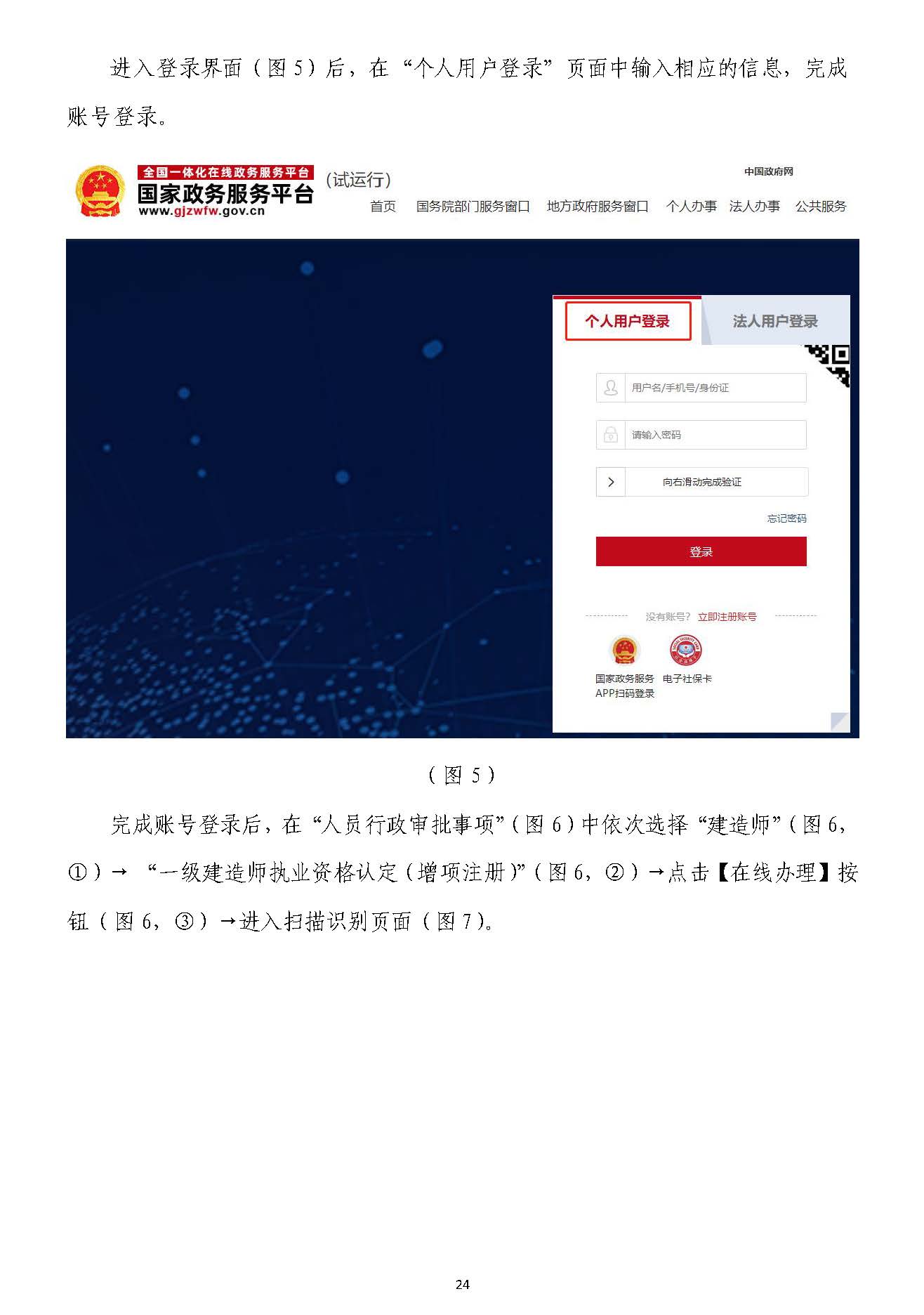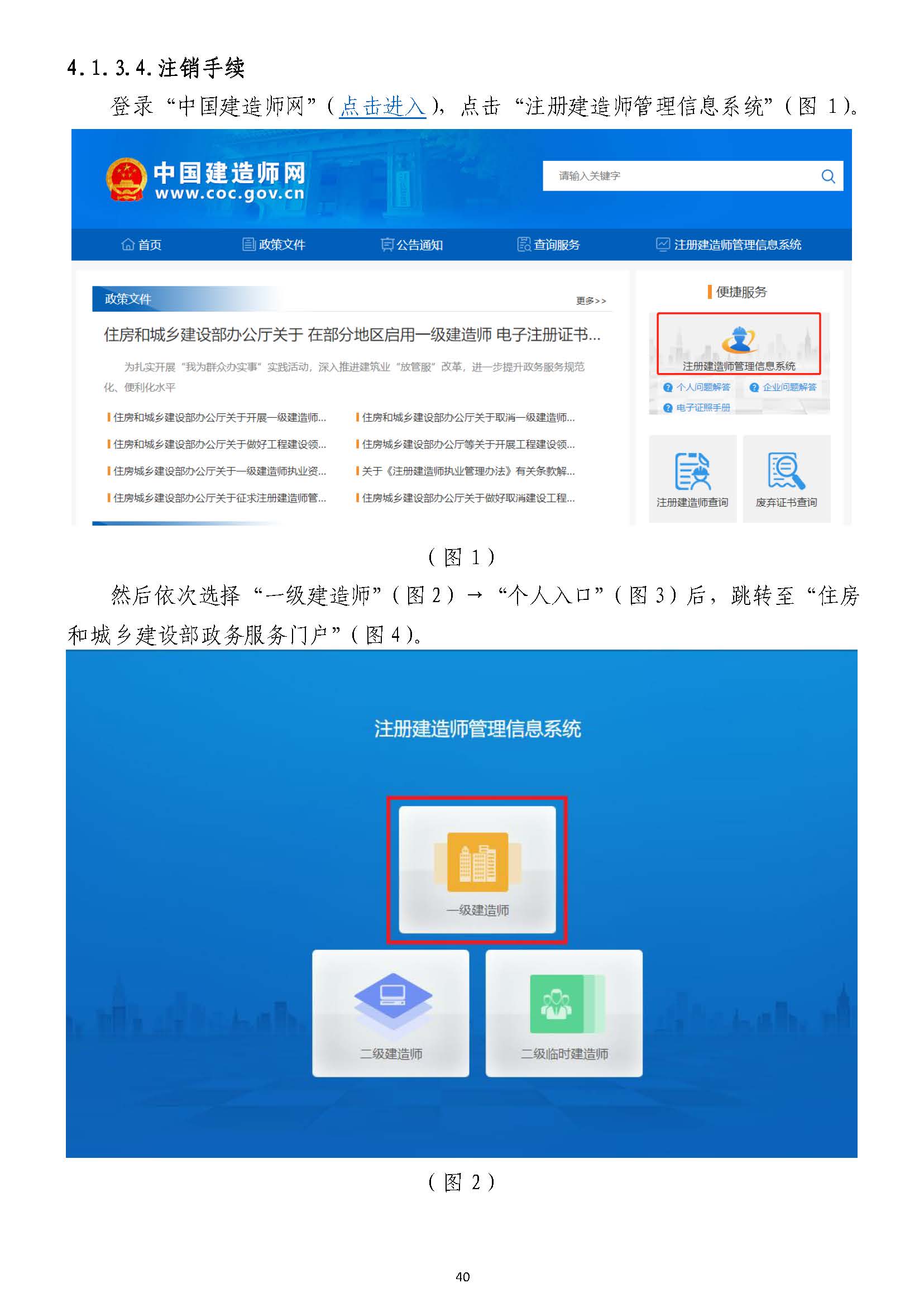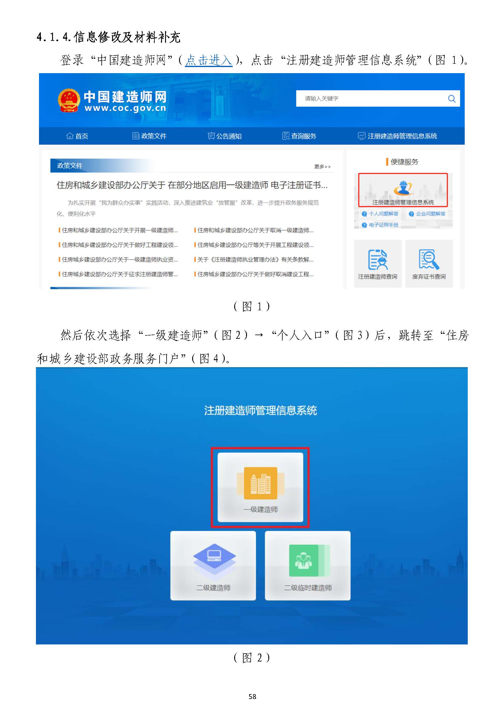 然后依次選擇“一級建造師”(圖22)→“個人入口”(圖)→“個人入口”(圖33)后,跳轉至“住房)后,跳轉至“住房和城鄉(xiāng)建設部政務服務門戶”(圖和城鄉(xiāng)建設部政務服務門戶”(圖44)。)。