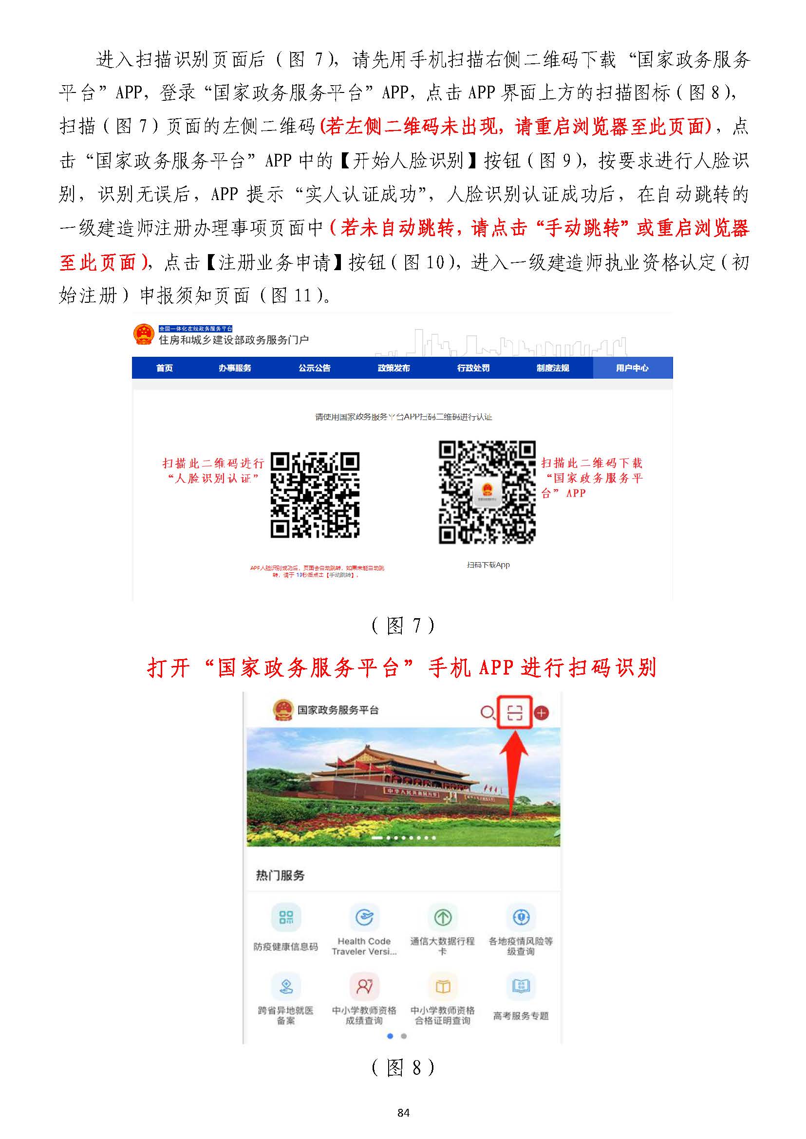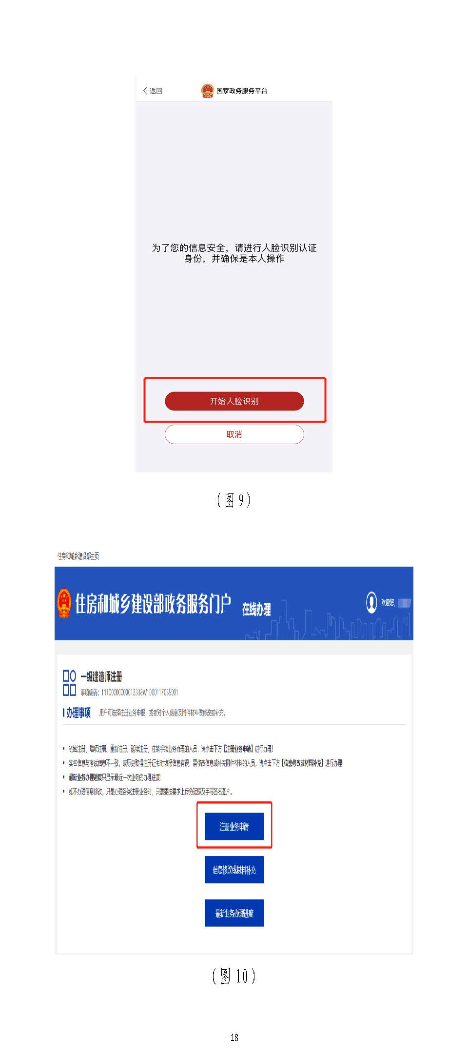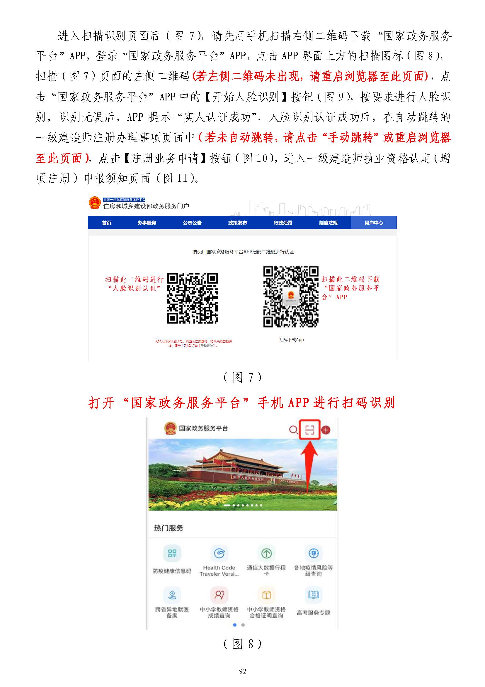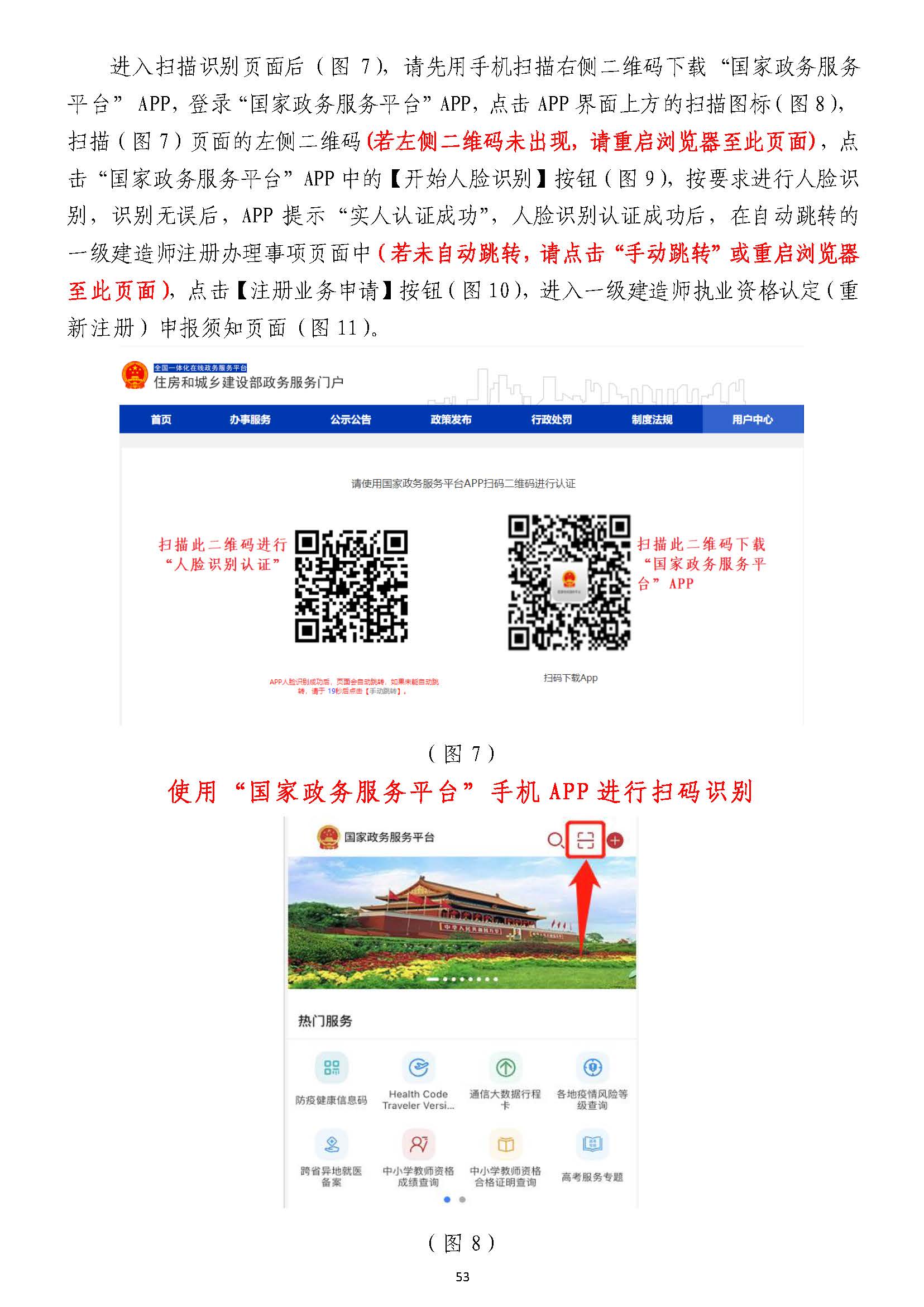 進入掃描識別頁面后(圖77),請先用手機掃描右側二維碼下載),請先用手機掃描右側二維碼下載“國家政務服務“國家政務服務平臺”平臺”APPAPP,登錄,登錄“國家政務服務平臺”“國家政務服務平臺”APPAPP,點擊,點擊APPAPP界面上方的掃描圖標(圖界面上方的掃描圖標(圖88),),掃描(圖掃描(圖77)頁面的左側二維碼)頁面的左側二維碼((若左側二維碼未出現(xiàn),請重啟瀏覽器至此頁面若左側二維碼未出現(xiàn),請重啟瀏覽器至此頁面)),點,點擊擊“國家政務服務平臺”“國家政務服務平臺”APPAPP中的【開始人臉識別】按鈕(圖中的【開始人臉識別】按鈕(圖99),按要求進行人臉識),按要求進行人臉識別,識別無誤別,識別無誤后,后,APPAPP提示“實人認證成提示“實人認證成功”,功”,人臉識別認證成功后,在自動跳轉的人臉識別認證成功后,在自動跳轉的一級建造師注冊辦理事項頁面中一級建造師注冊辦理事項頁面中(若未自動跳轉,(若未自動跳轉,請點擊“手動跳轉”或請點擊“手動跳轉”或重啟瀏覽器重啟瀏覽器至此頁面)至此頁面),點擊【注冊業(yè)務申請】按鈕(圖,點擊【注冊業(yè)務申請】按鈕(圖1010),進入一級建造師執(zhí)業(yè)資格認定(),進入一級建造師執(zhí)業(yè)資格認定(重重新新注冊)申報須知頁面(圖注冊)申報須知頁面(圖1111))。。
