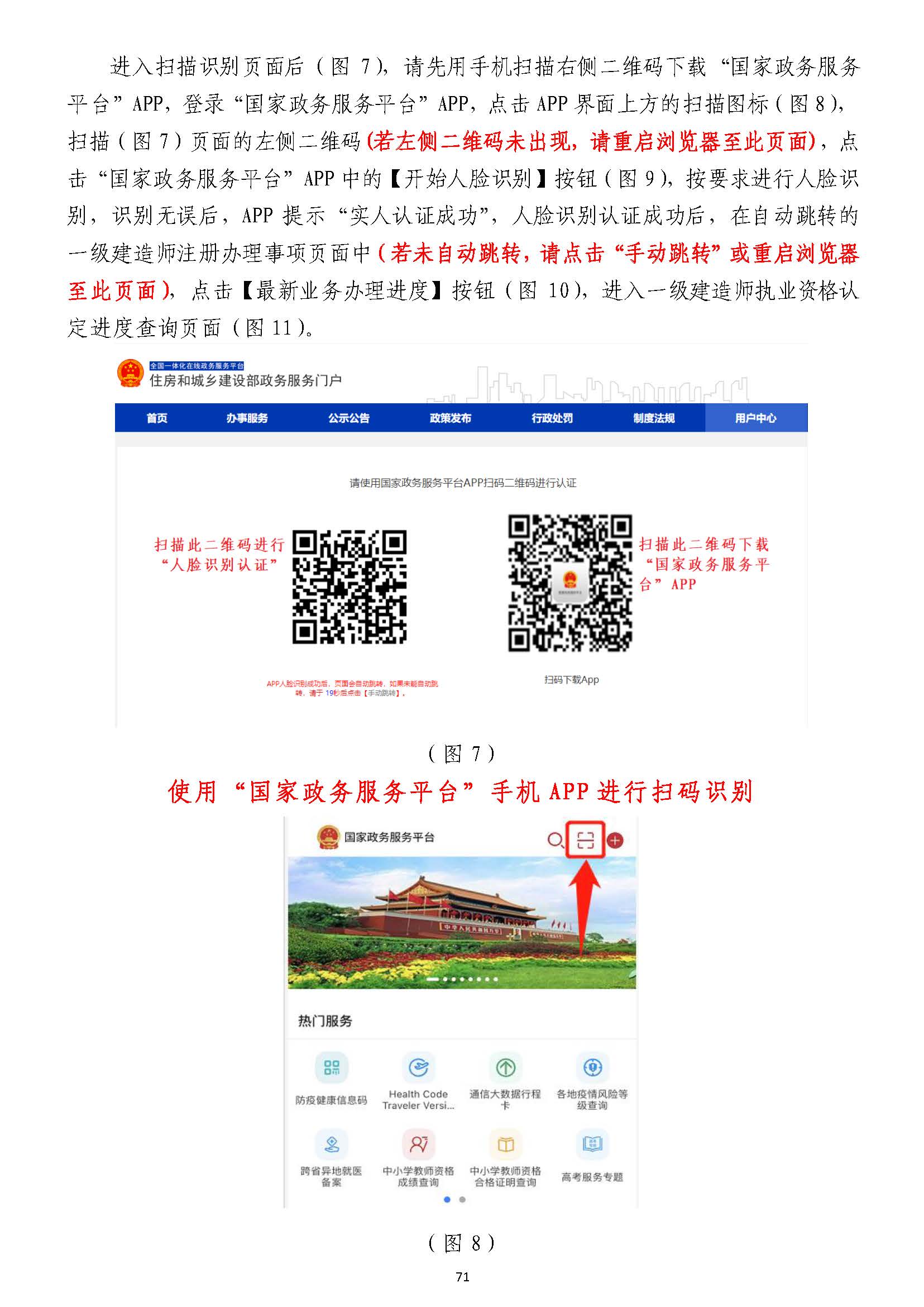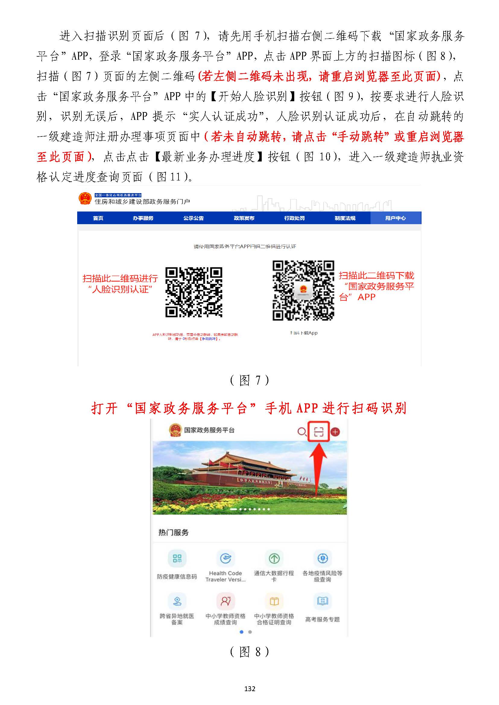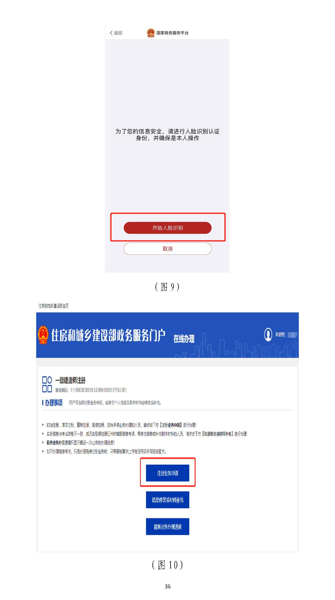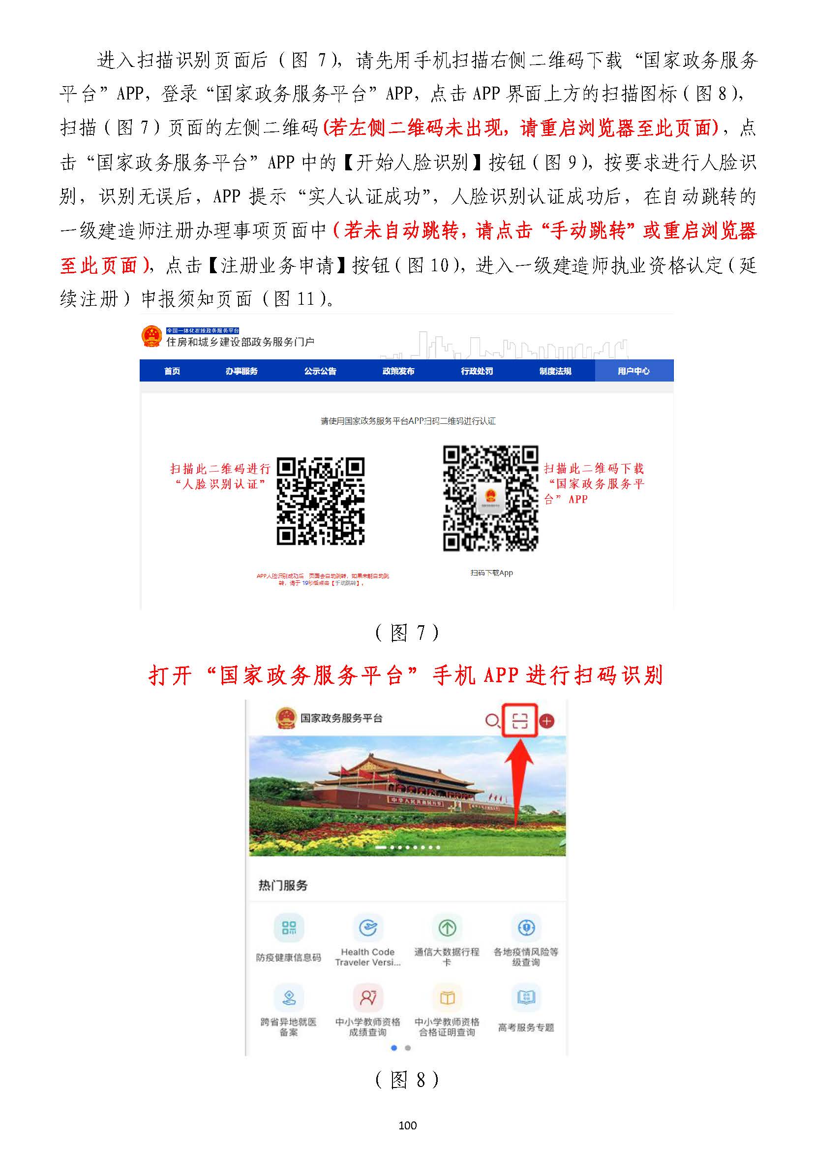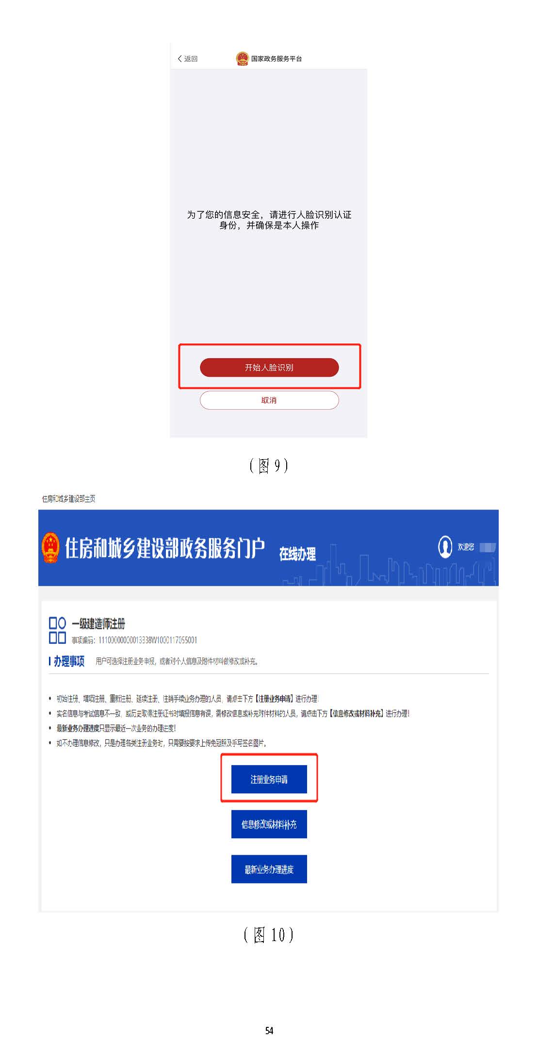 進入掃描識別頁面后(圖77),請先用手機掃描右側二維碼下載),請先用手機掃描右側二維碼下載“國家政務服務“國家政務服務平臺”平臺”APPAPP,登錄,登錄“國家政務服務平臺”“國家政務服務平臺”APPAPP,點擊,點擊APPAPP界面上方的掃描圖標(圖界面上方的掃描圖標(圖88),),掃描(圖掃描(圖77)頁面的左側二維碼)頁面的左側二維碼((若左側二維碼未出現(xiàn),請重啟瀏覽器至此頁面若左側二維碼未出現(xiàn),請重啟瀏覽器至此頁面)),點,點擊擊“國家政務服務平臺”“國家政務服務平臺”APPAPP中的【開始人臉識別】按鈕(圖中的【開始人臉識別】按鈕(圖99),按要求進行人臉識),按要求進行人臉識別,識別無誤別,識別無誤后,后,APPAPP提示“實人認證成提示“實人認證成功”,功”,人臉識別認證成功后,在自動跳轉的人臉識別認證成功后,在自動跳轉的一級建造師注冊辦理事項頁面中一級建造師注冊辦理事項頁面中(若未自動跳轉,(若未自動跳轉,請點擊“手動跳轉”或請點擊“手動跳轉”或重啟瀏覽器重啟瀏覽器至此頁面)至此頁面),點擊【注冊業(yè)務申請】按鈕(圖,點擊【注冊業(yè)務申請】按鈕(圖1010),進入一級建造師執(zhí)業(yè)資格認定(),進入一級建造師執(zhí)業(yè)資格認定(重重新新注冊)申報須知頁面(圖注冊)申報須知頁面(圖1111))。。