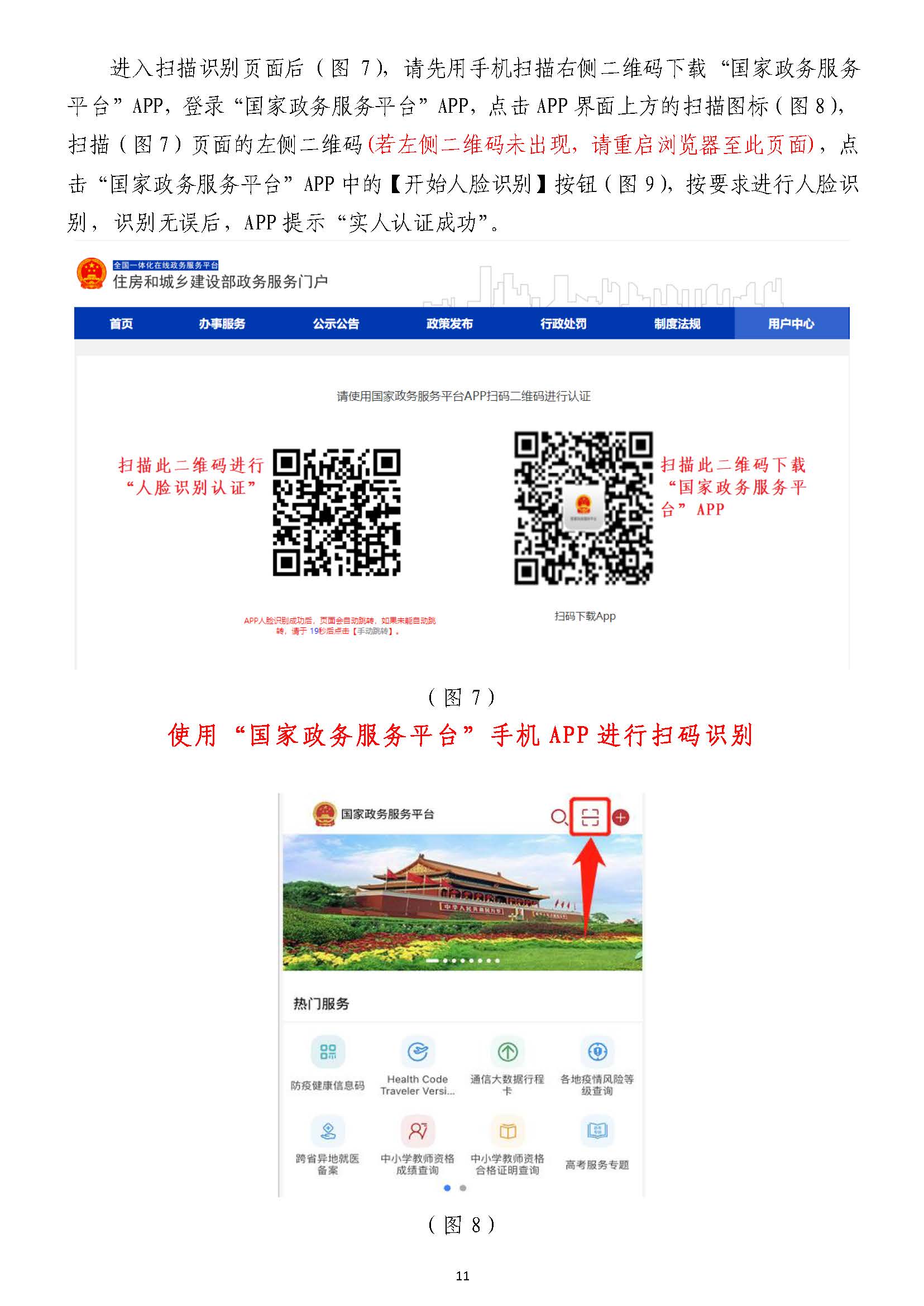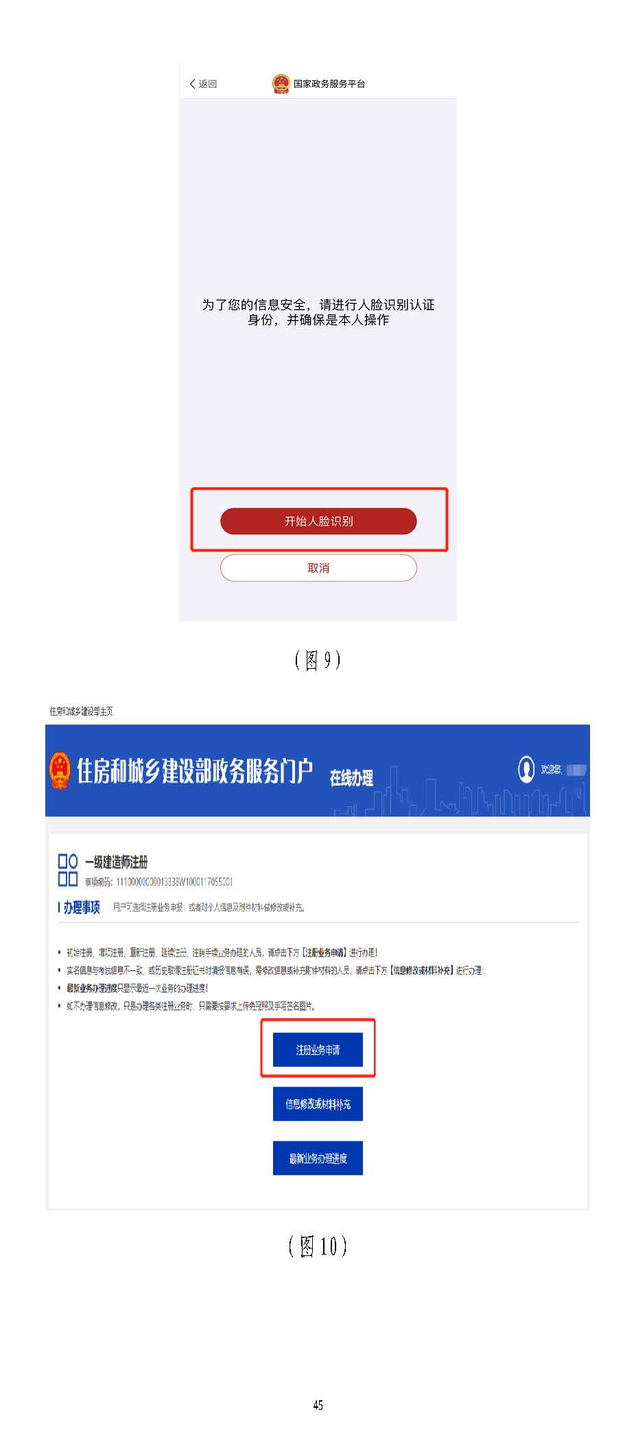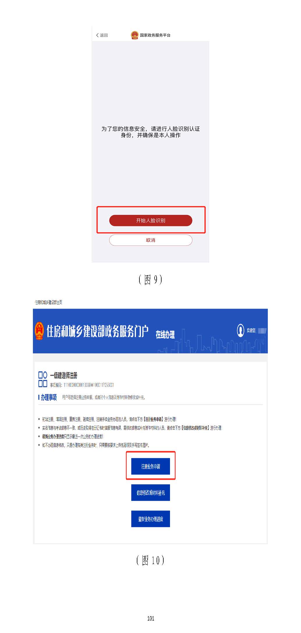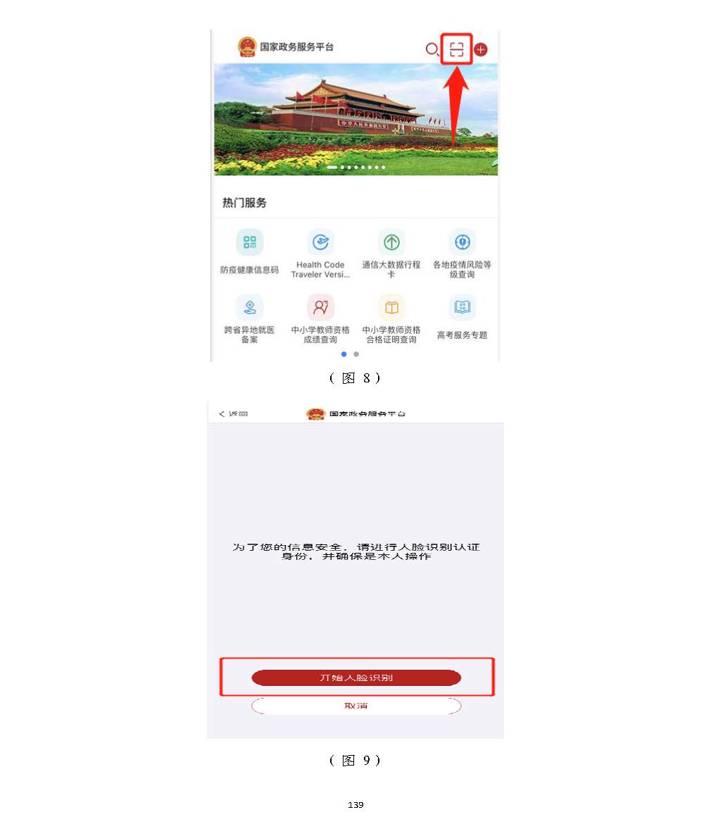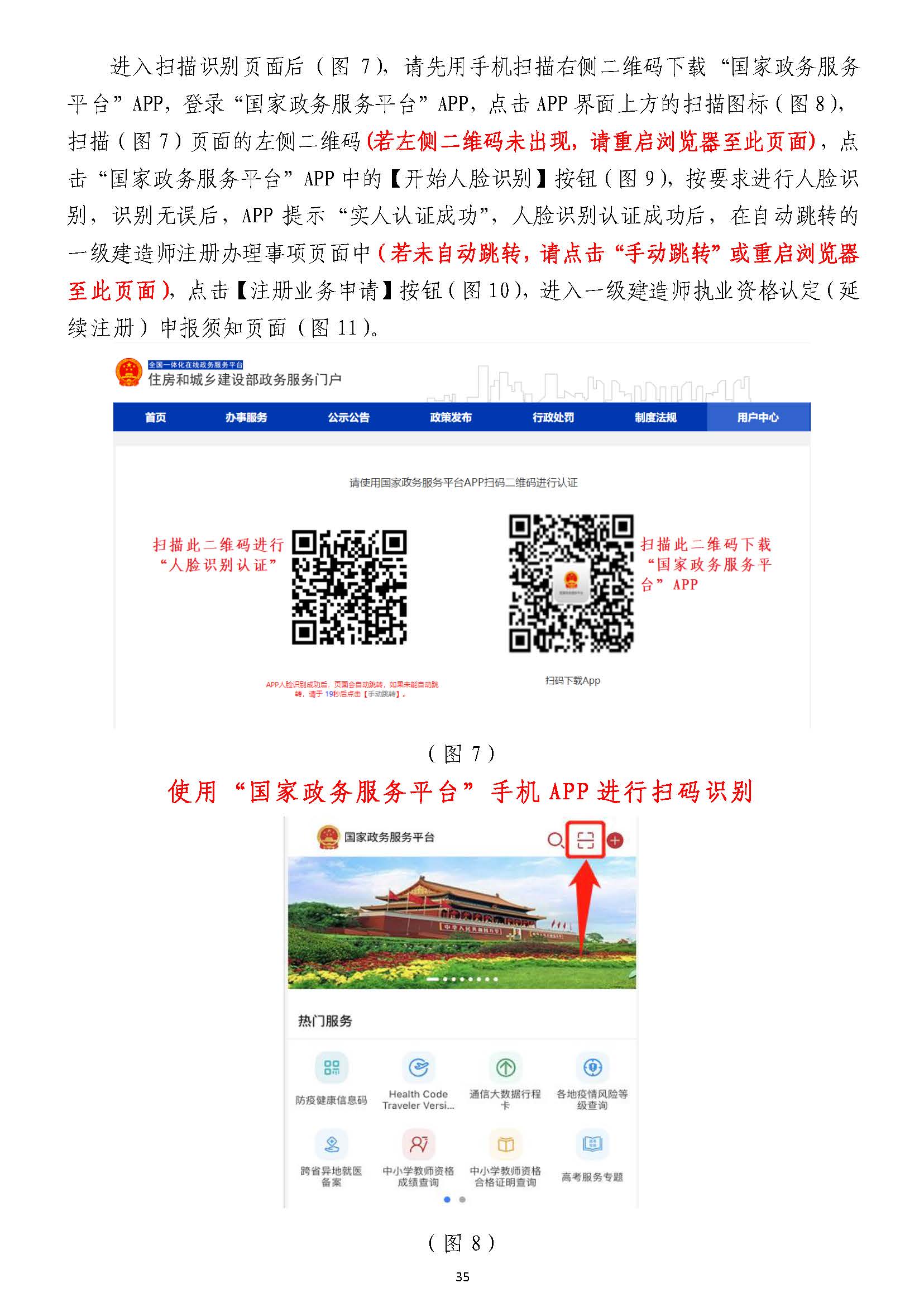 進入掃描識別頁面后(圖77),請先用手機掃描右側二維碼下載),請先用手機掃描右側二維碼下載“國家政務服務“國家政務服務平臺”平臺”APPAPP,登錄,登錄“國家政務服務平臺”“國家政務服務平臺”APPAPP,點擊,點擊APPAPP界面上方的掃描圖標(圖界面上方的掃描圖標(圖88),),掃描(圖掃描(圖77)頁面的左側二維碼)頁面的左側二維碼((若左側二維碼未出現(xiàn),請重啟瀏覽器至此頁面若左側二維碼未出現(xiàn),請重啟瀏覽器至此頁面)),點,點擊擊“國家政務服務平臺”“國家政務服務平臺”APPAPP中的【開始人臉識別】按鈕(圖中的【開始人臉識別】按鈕(圖99),按要求進行人臉識),按要求進行人臉識別,識別無誤別,識別無誤后,后,APPAPP提示“實人認證成提示“實人認證成功”,功”,人臉識別認證成功后,在自動跳轉的人臉識別認證成功后,在自動跳轉的一級建造師注冊辦理事項頁面中一級建造師注冊辦理事項頁面中(若未自動跳轉,(若未自動跳轉,請點擊“手動跳轉”或請點擊“手動跳轉”或重啟瀏覽器重啟瀏覽器至此頁面)至此頁面),點擊【注冊業(yè)務申請】按鈕(圖,點擊【注冊業(yè)務申請】按鈕(圖1010),進入一級建造師執(zhí)業(yè)資格認定(),進入一級建造師執(zhí)業(yè)資格認定(重重新新注冊)申報須知頁面(圖注冊)申報須知頁面(圖1111))。。