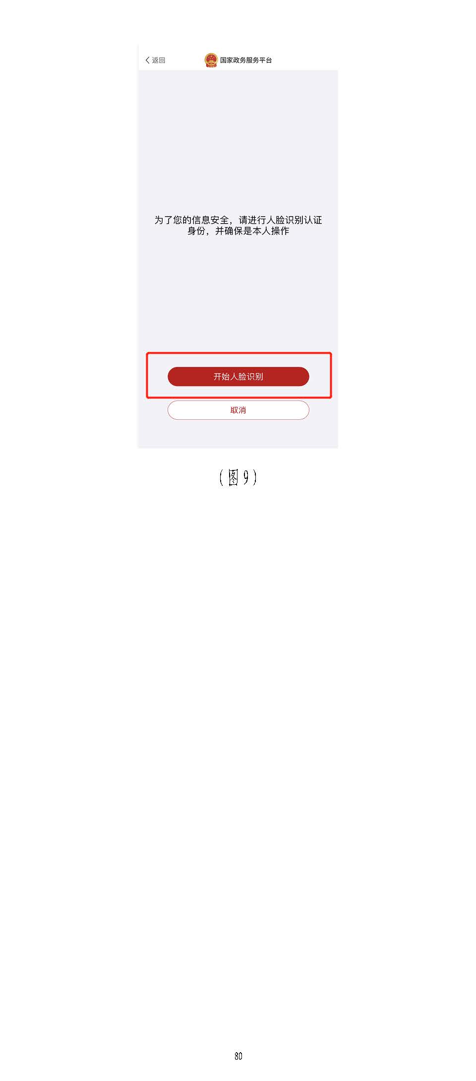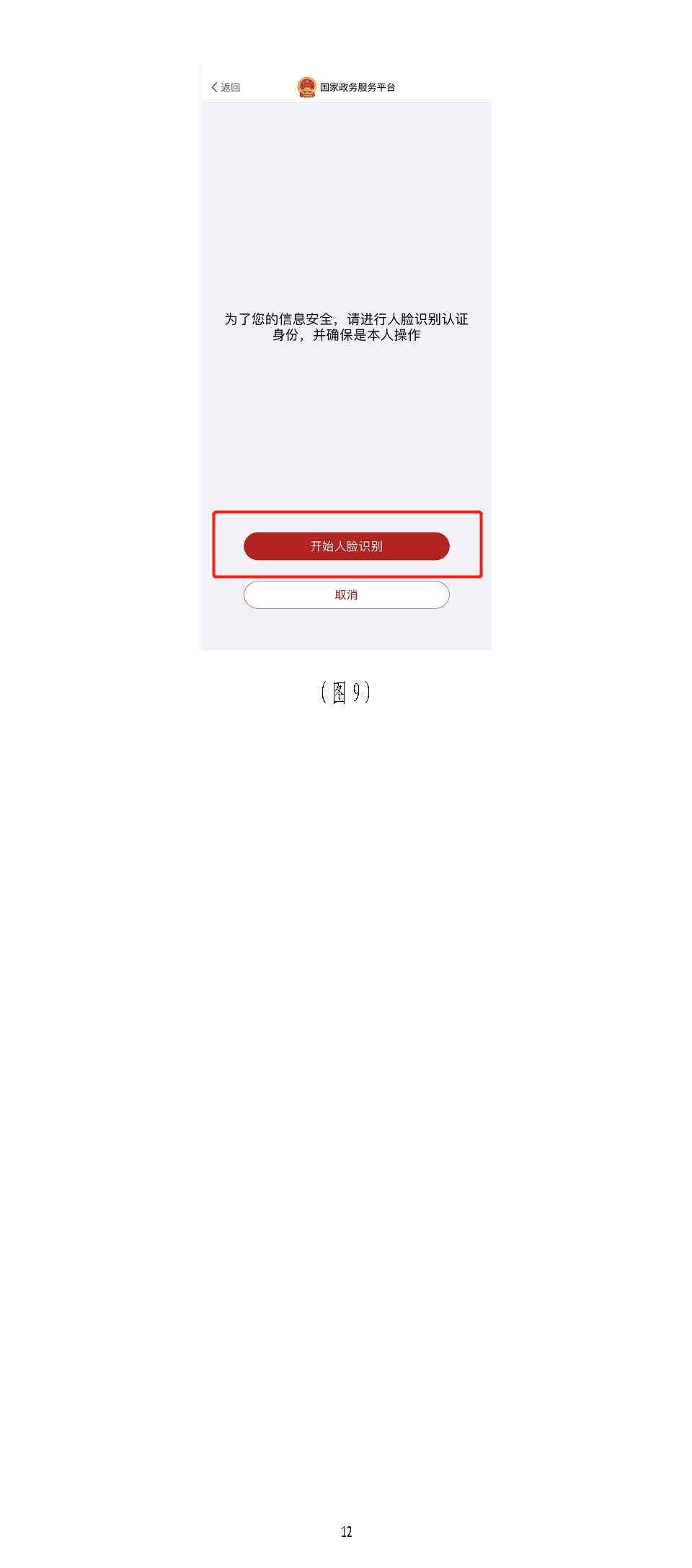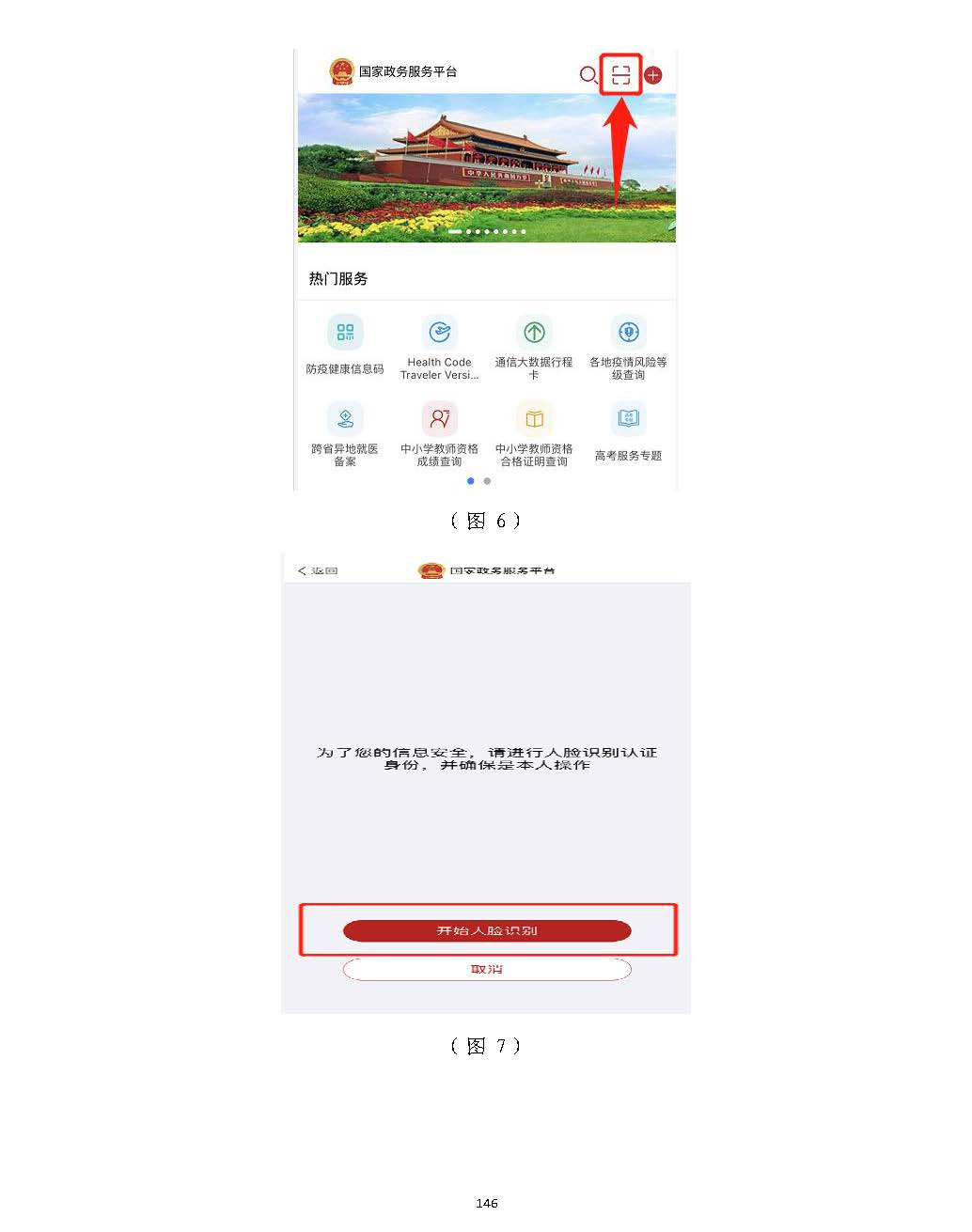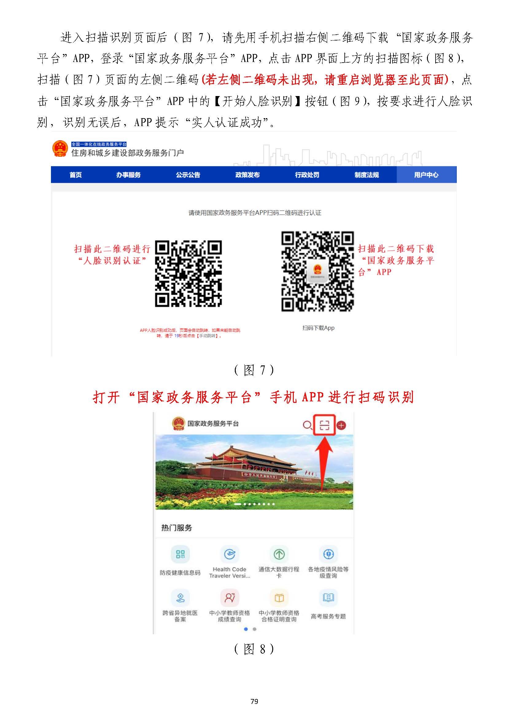 進入掃描識別頁面后(圖77),請先用手機掃描右側二維碼下載),請先用手機掃描右側二維碼下載“國家政務服務“國家政務服務平臺”平臺”APPAPP,登錄,登錄“國家政務服務平臺”“國家政務服務平臺”APPAPP,點擊,點擊APPAPP界面上方的掃描圖標(圖界面上方的掃描圖標(圖88),),掃描(圖掃描(圖77)頁面的左側二維碼)頁面的左側二維碼((若左側二維碼未出現(xiàn),請重啟瀏覽器至此頁面若左側二維碼未出現(xiàn),請重啟瀏覽器至此頁面)),點,點擊擊“國家政務服務平臺”“國家政務服務平臺”APPAPP中的【開始人臉識別】按鈕(圖中的【開始人臉識別】按鈕(圖99),按要求進行人臉識),按要求進行人臉識別,識別無誤別,識別無誤后,后,APPAPP提示“實人認證成提示“實人認證成功”,功”,人臉識別認證成功后,在自動跳轉的人臉識別認證成功后,在自動跳轉的一級建造師注冊辦理事項頁面中一級建造師注冊辦理事項頁面中(若未自動跳轉,(若未自動跳轉,請點擊“手動跳轉”或請點擊“手動跳轉”或重啟瀏覽器重啟瀏覽器至此頁面)至此頁面),點擊【注冊業(yè)務申請】按鈕(圖,點擊【注冊業(yè)務申請】按鈕(圖1010),進入一級建造師執(zhí)業(yè)資格認定(),進入一級建造師執(zhí)業(yè)資格認定(重重新新注冊)申報須知頁面(圖注冊)申報須知頁面(圖1111))。。