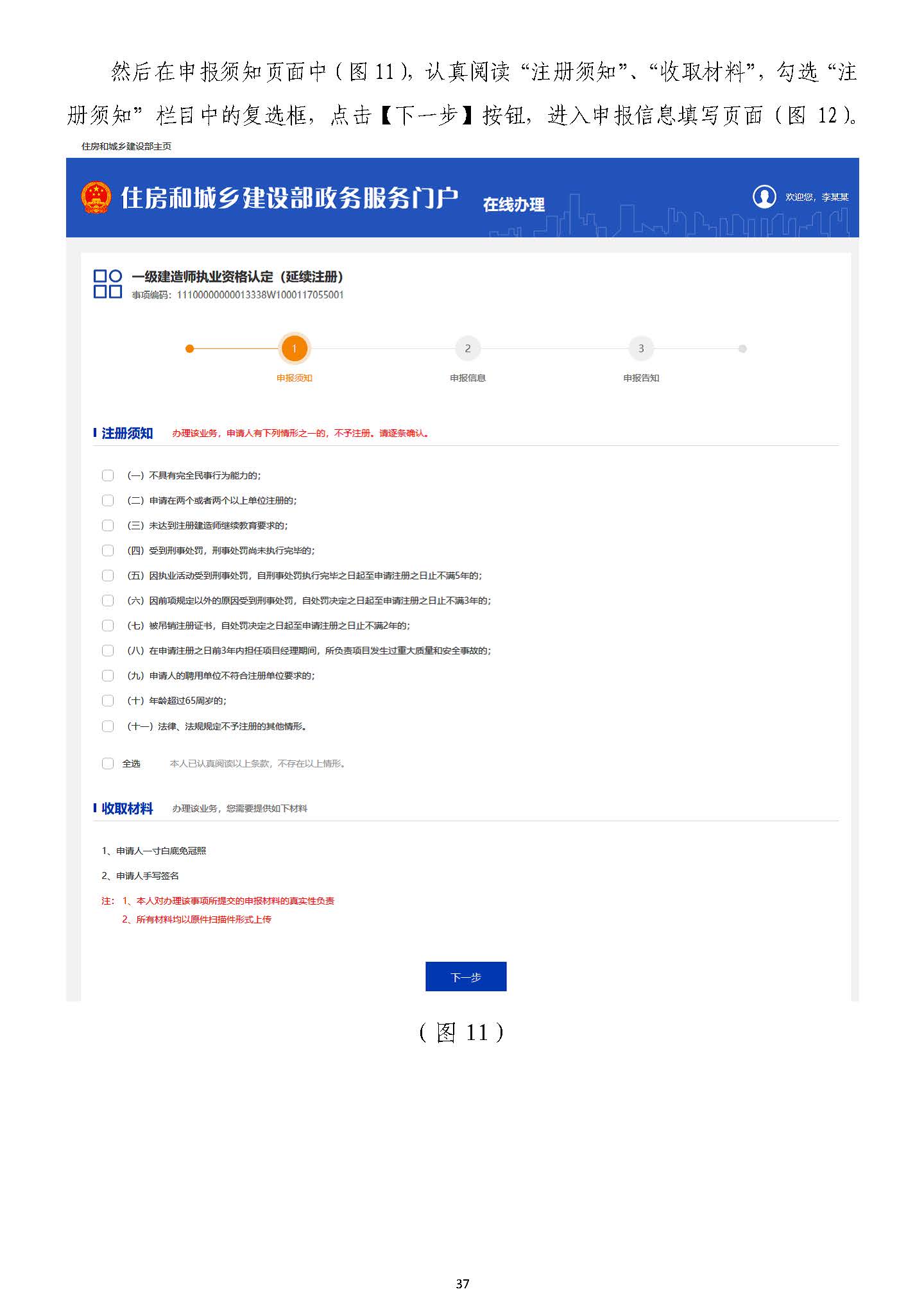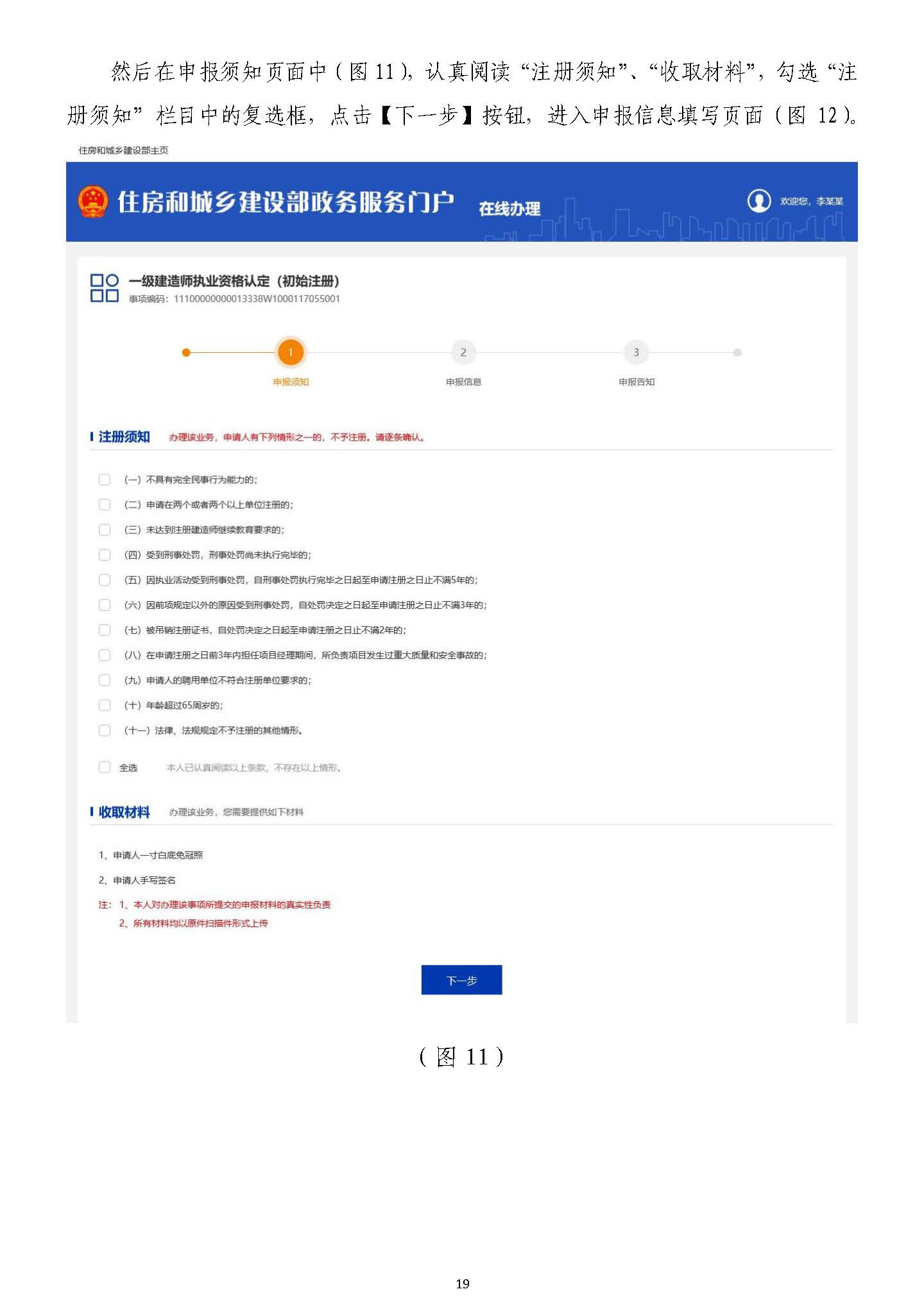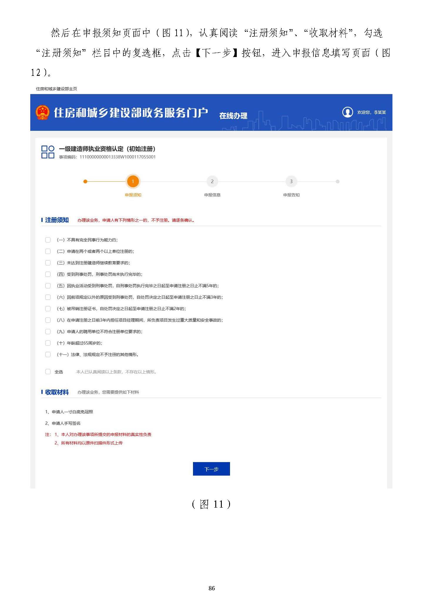 然后在申報須知頁面中(圖1111),認真閱讀“注冊須知”、“收取材料”,勾選“注),認真閱讀“注冊須知”、“收取材料”,勾選“注冊須知”欄目中的復選框,點擊【下一步】按鈕,進入申報信息填寫頁面(圖冊須知”欄目中的復選框,點擊【下一步】按鈕,進入申報信息填寫頁面(圖1212)。)。