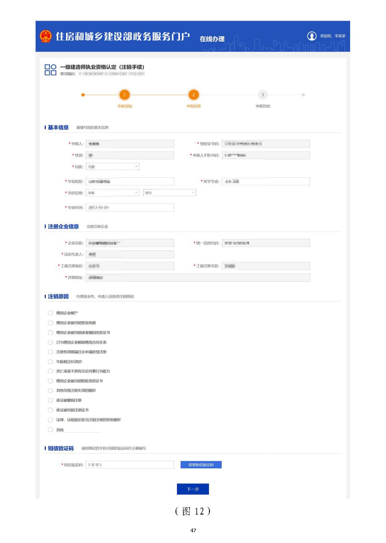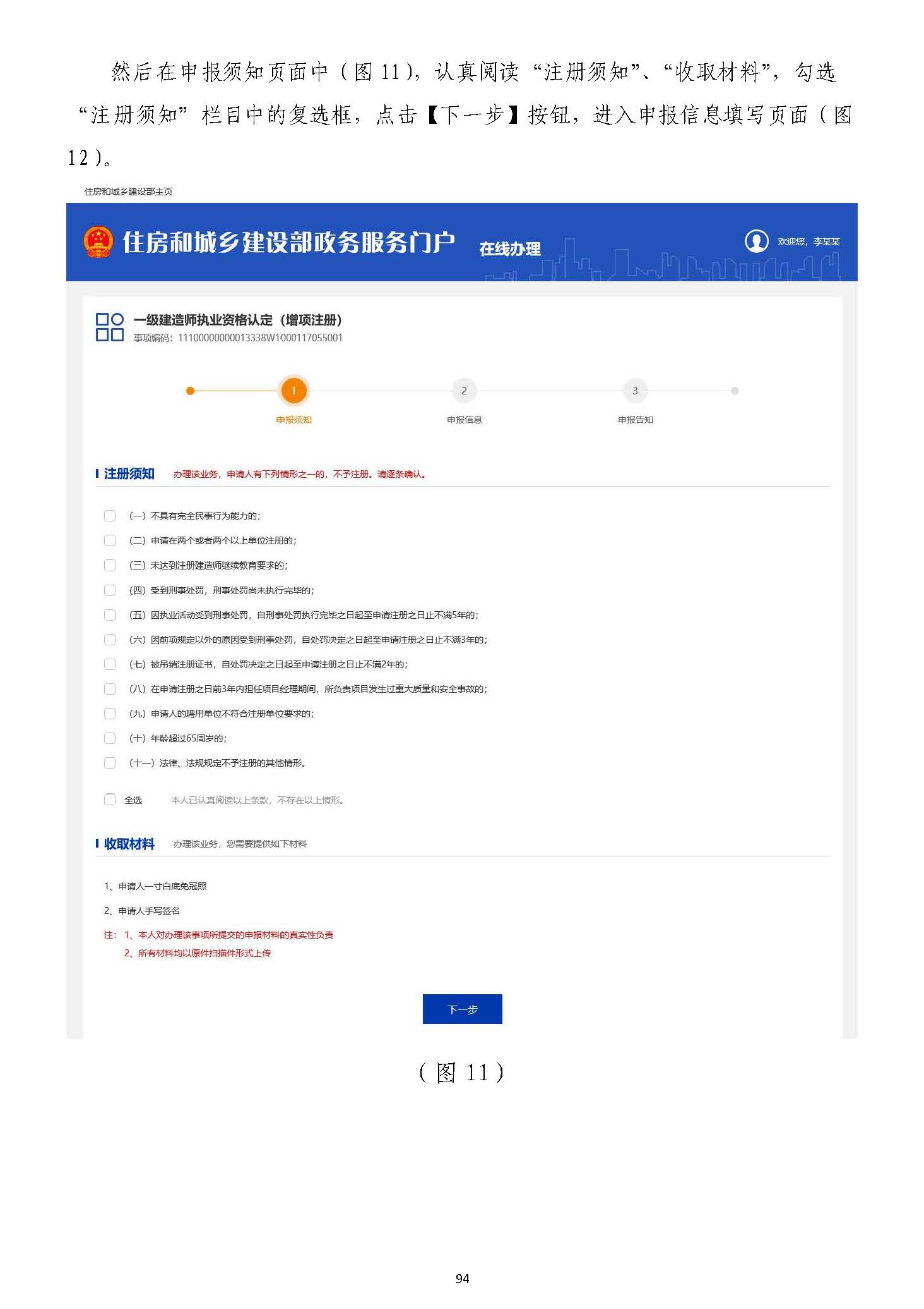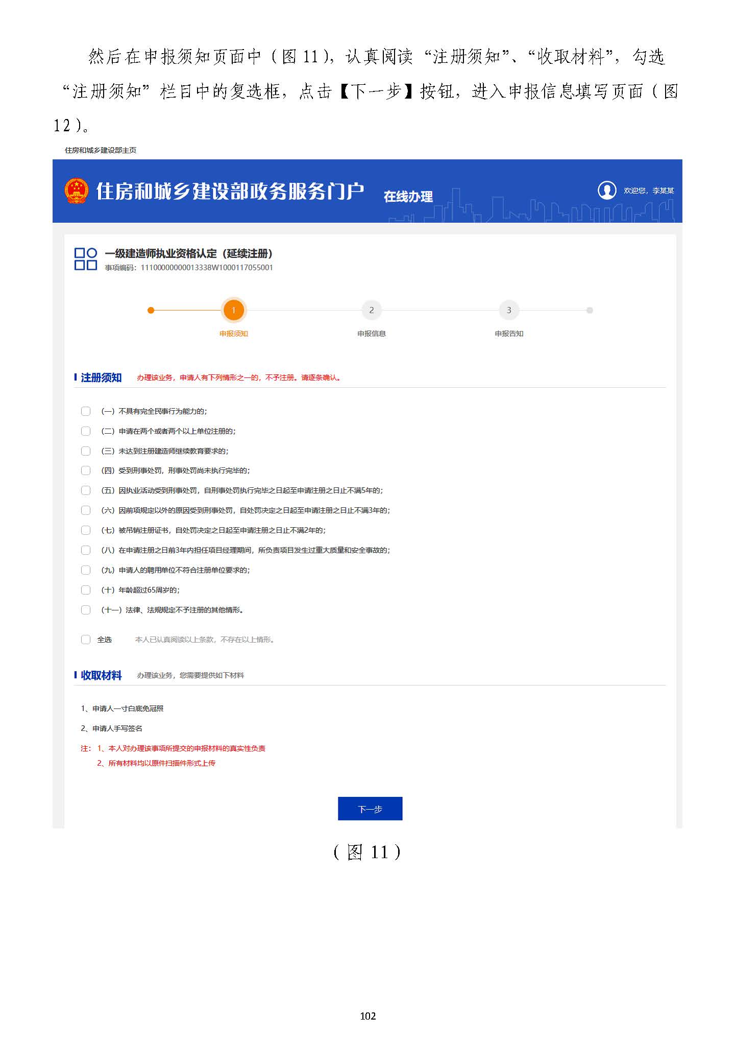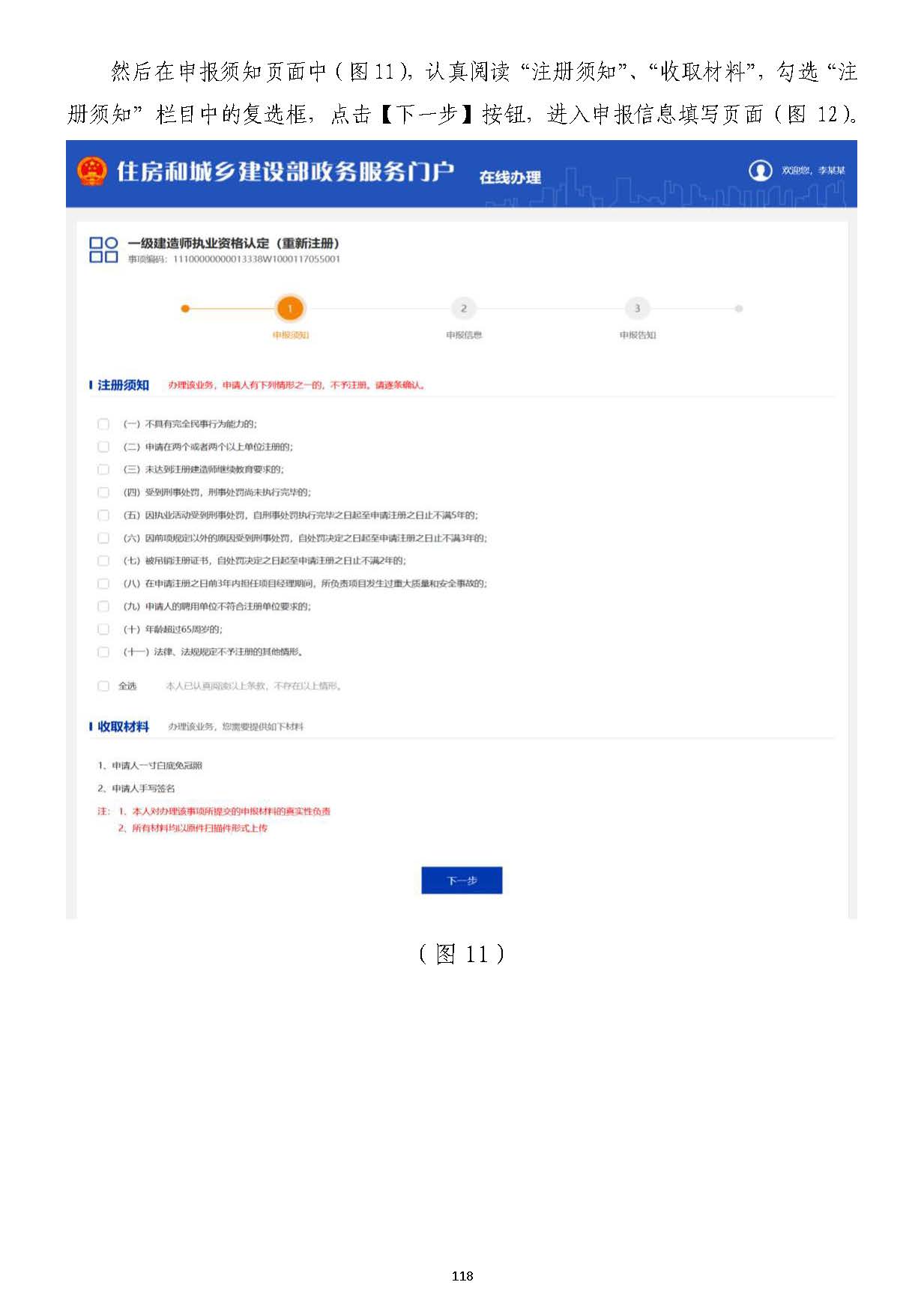 然后在申報須知頁面中(圖1111),認真閱讀“注冊須知”、“收取材料”,勾選“注),認真閱讀“注冊須知”、“收取材料”,勾選“注冊須知”欄目中的復選框,點擊【下一步】按鈕,進入申報信息填寫頁面(圖冊須知”欄目中的復選框,點擊【下一步】按鈕,進入申報信息填寫頁面(圖1212)。)。