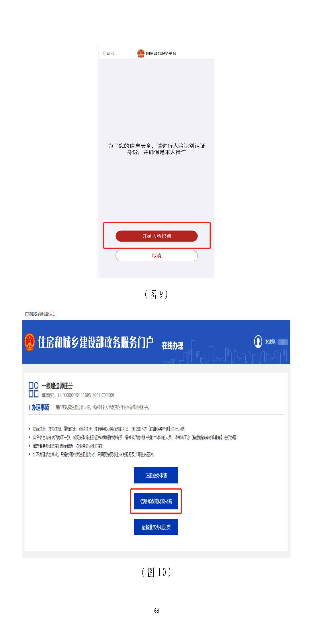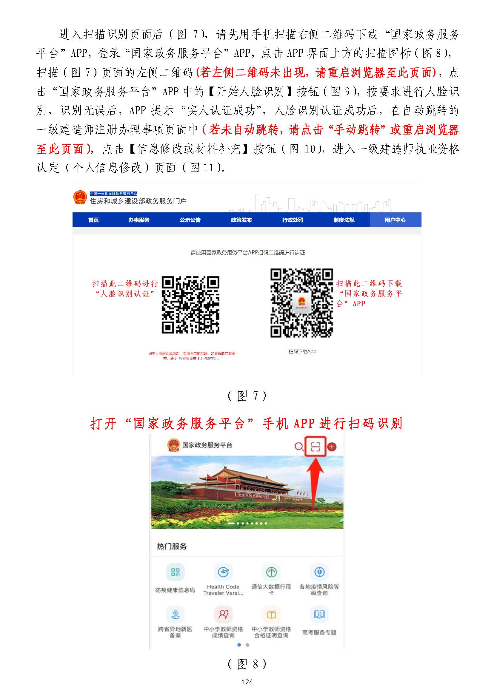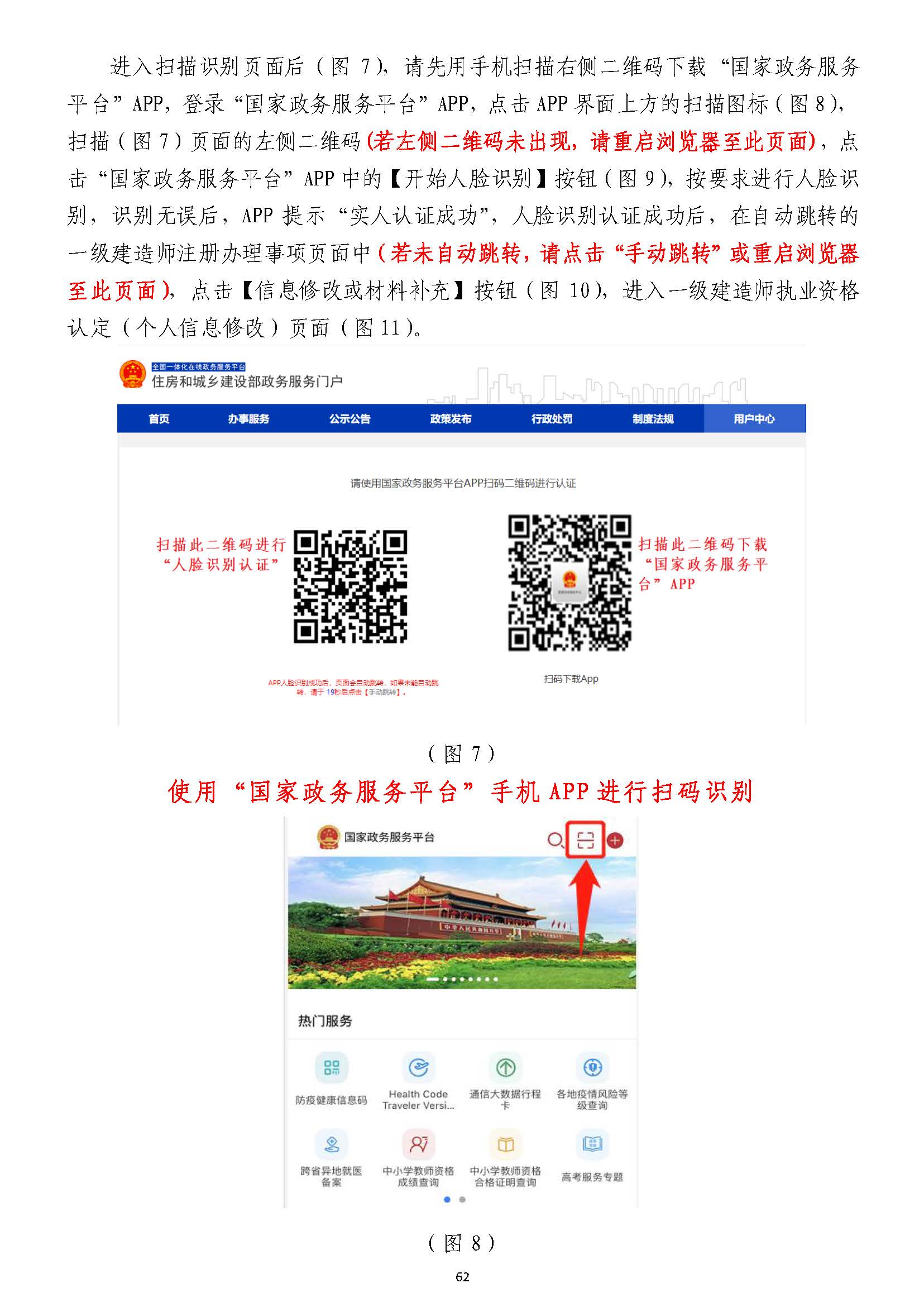 進入掃描識別頁面后(圖77),請先用手機掃描右側二維碼下載),請先用手機掃描右側二維碼下載“國家政務服務“國家政務服務平臺”平臺”APPAPP,登錄,登錄“國家政務服務平臺”“國家政務服務平臺”APPAPP,點擊,點擊APPAPP界面上方的掃描圖標(圖界面上方的掃描圖標(圖88),),掃描掃描(圖(圖77))頁面的左側二維碼頁面的左側二維碼((若左側二維碼未出現(xiàn),請重啟瀏覽器至此頁面若左側二維碼未出現(xiàn),請重啟瀏覽器至此頁面)),點,點擊擊“國家政務服務平臺”“國家政務服務平臺”APPAPP中的【開始人臉識別】按鈕(圖中的【開始人臉識別】按鈕(圖99),按要求進行人臉識),按要求進行人臉識別,識別無誤后,別,識別無誤后,APPAPP提示“實人認證成功”,提示“實人認證成功”,人臉識別認證成功后,在自動跳轉的人臉識別認證成功后,在自動跳轉的一一級建造師注冊辦理事項頁面中級建造師注冊辦理事項頁面中(若未自動跳轉,(若未自動跳轉,請點擊“手動跳轉”或請點擊“手動跳轉”或重啟瀏覽器重啟瀏覽器至此頁面)至此頁面),,點擊【信息修改或材料補充】按鈕(圖點擊【信息修改或材料補充】按鈕(圖1010),進入一級建造師執(zhí)業(yè)資格),進入一級建造師執(zhí)業(yè)資格認定(個人信息修改)認定(個人信息修改)頁面頁面(圖(圖1111))。。