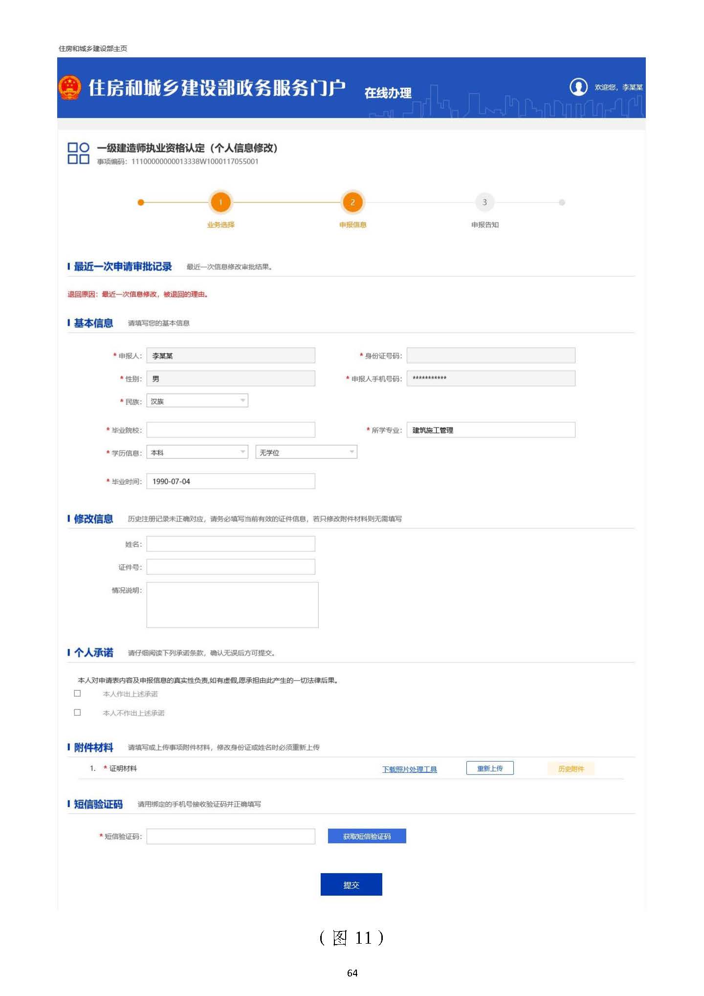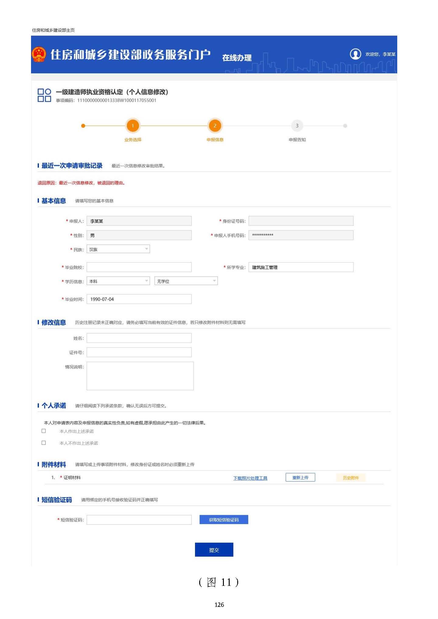 一、若僅修改民族、畢業(yè)院校、所學專業(yè)、學歷信息、畢業(yè)時間,可在“基本信息”欄信息”欄目中進行修改后,在“短信驗證碼”欄目中,點擊【獲取短信驗證碼】按目中進行修改后,在“短信驗證碼”欄目中,點擊【獲取短信驗證碼】按鈕,輸入發(fā)送至手機的短信驗證碼,然后點擊【提交】按鈕即可完成修改。鈕,輸入發(fā)送至手機的短信驗證碼,然后點擊【提交】按鈕即可完成修改。((注:注:請不要在“修改信息”欄目中輸入任何信息,也不要上傳任何附件材料請不要在“修改信息”欄目中輸入任何信息,也不要上傳任何附件材料))