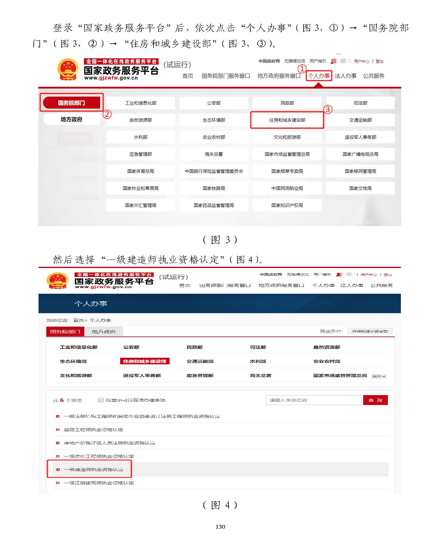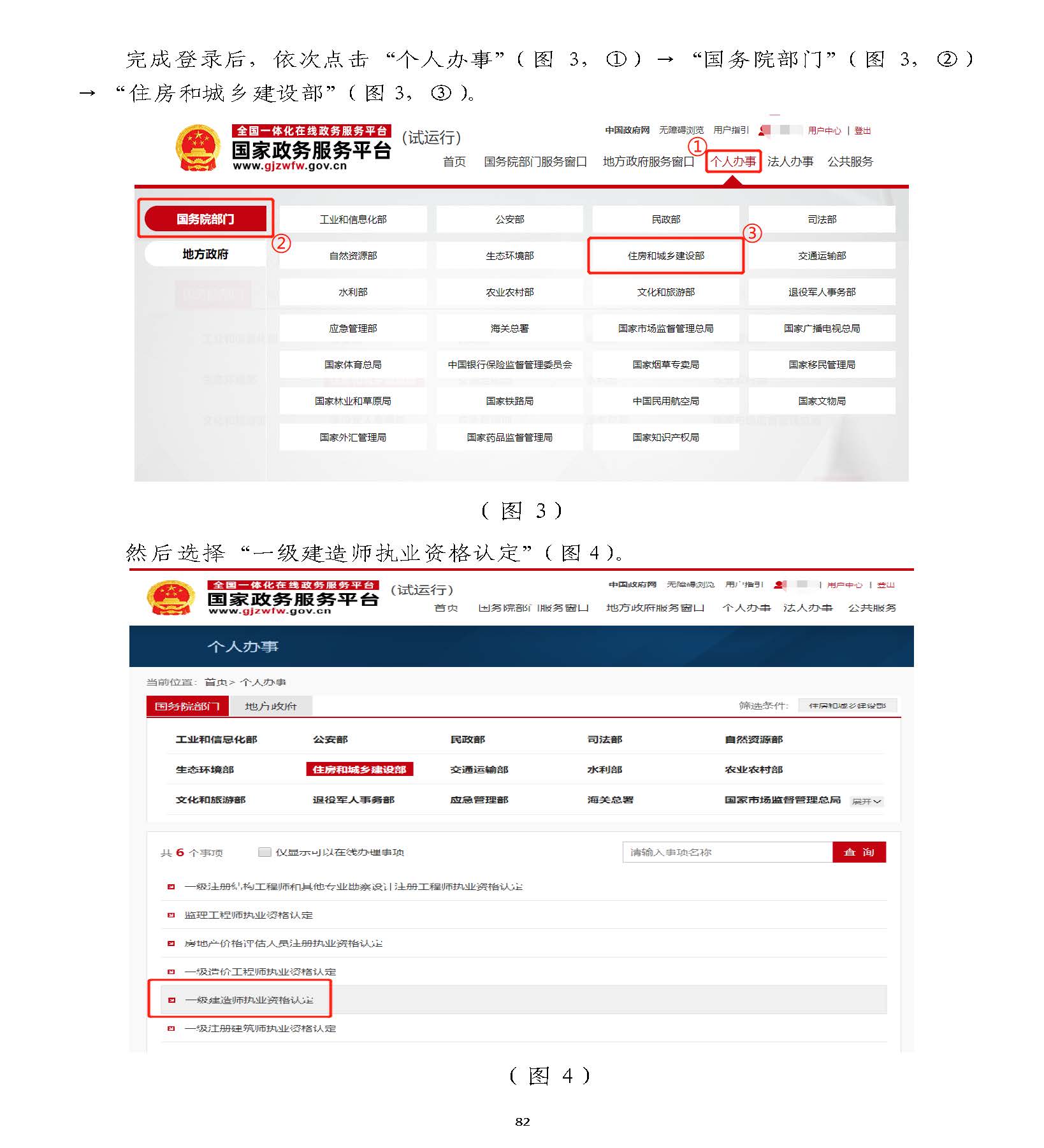 登錄“國家政務服務平臺”后,依次點擊“個人辦事”(圖33,①)→“國務院部,①)→“國務院部門”(圖門”(圖33,②)→“住房和城鄉(xiāng)建設部”(圖,②)→“住房和城鄉(xiāng)建設部”(圖33,③)。,③)。