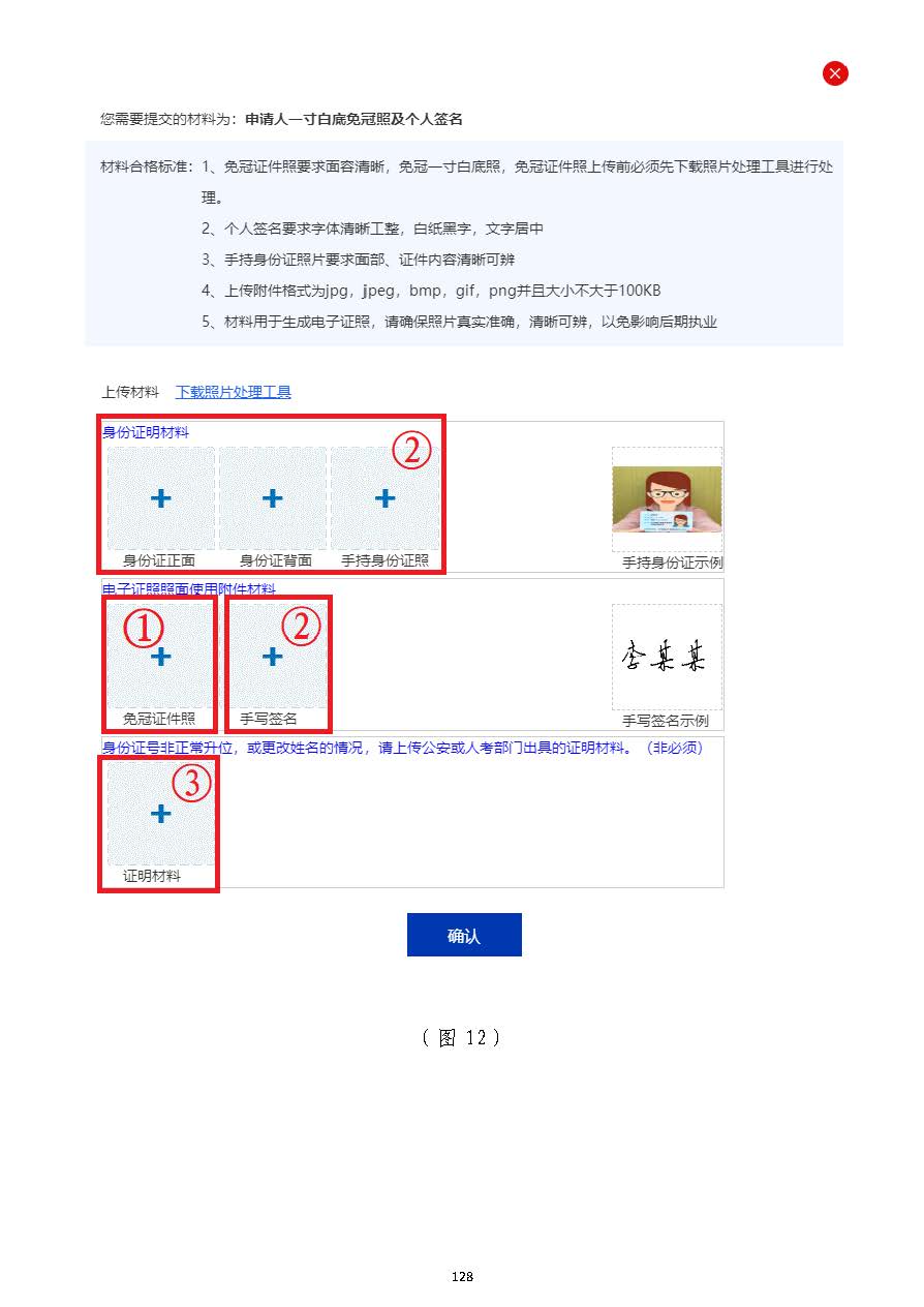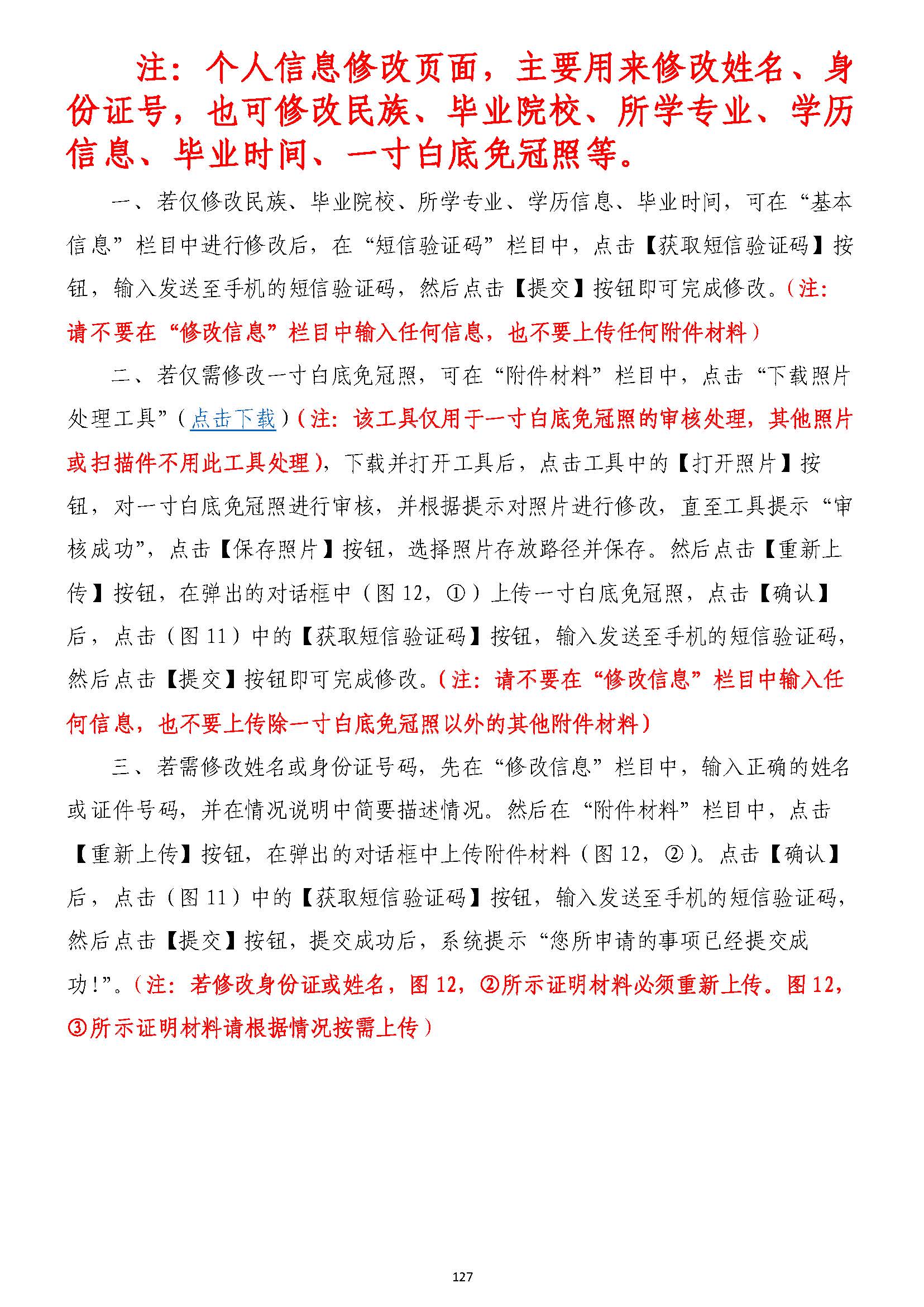 二、若僅需修改一寸白底免冠照一寸白底免冠照,可在“附件材料”欄目中,點擊“下載照片,可在“附件材料”欄目中,點擊“下載照片處理工具”(處理工具”(點擊下載點擊下載))(注:該工具僅用于一寸白底免冠照的審核處理,其他照片(注:該工具僅用于一寸白底免冠照的審核處理,其他照片或掃描件不用此工具處理)或掃描件不用此工具處理),下載并打開工具后,下載并打開工具后,點擊工具中的【打開照片】按,點擊工具中的【打開照片】按鈕,對一寸白底免冠照進行審核,并根據(jù)提示對照片進行修改,直至工具提示“審鈕,對一寸白底免冠照進行審核,并根據(jù)提示對照片進行修改,直至工具提示“審核成功”,點擊【保存照片】按鈕,選擇照片存放路徑并保存。然后點擊【重新上核成功”,點擊【保存照片】按鈕,選擇照片存放路徑并保存。然后點擊【重新上傳】按鈕,在彈出的對話框中(圖傳】按鈕,在彈出的對話框中(圖1122,①)上傳,①)上傳一寸白底免冠照一寸白底免冠照,點擊【確認】,點擊【確認】后,點擊(圖后,點擊(圖1111)中的【獲取短信驗證碼】按鈕,輸入發(fā)送至手機的短信驗證碼,)中的【獲取短信驗證碼】按鈕,輸入發(fā)送至手機的短信驗證碼,然后點擊【提交】按鈕即可完成修改。然后點擊【提交】按鈕即可完成修改。(注:請不要在“修改信息”欄目中輸入任(注:請不要在“修改信息”欄目中輸入任何信息,也不要上傳除一寸白底免冠照以外的其他附件材料)何信息,也不要上傳除一寸白底免冠照以外的其他附件材料)
