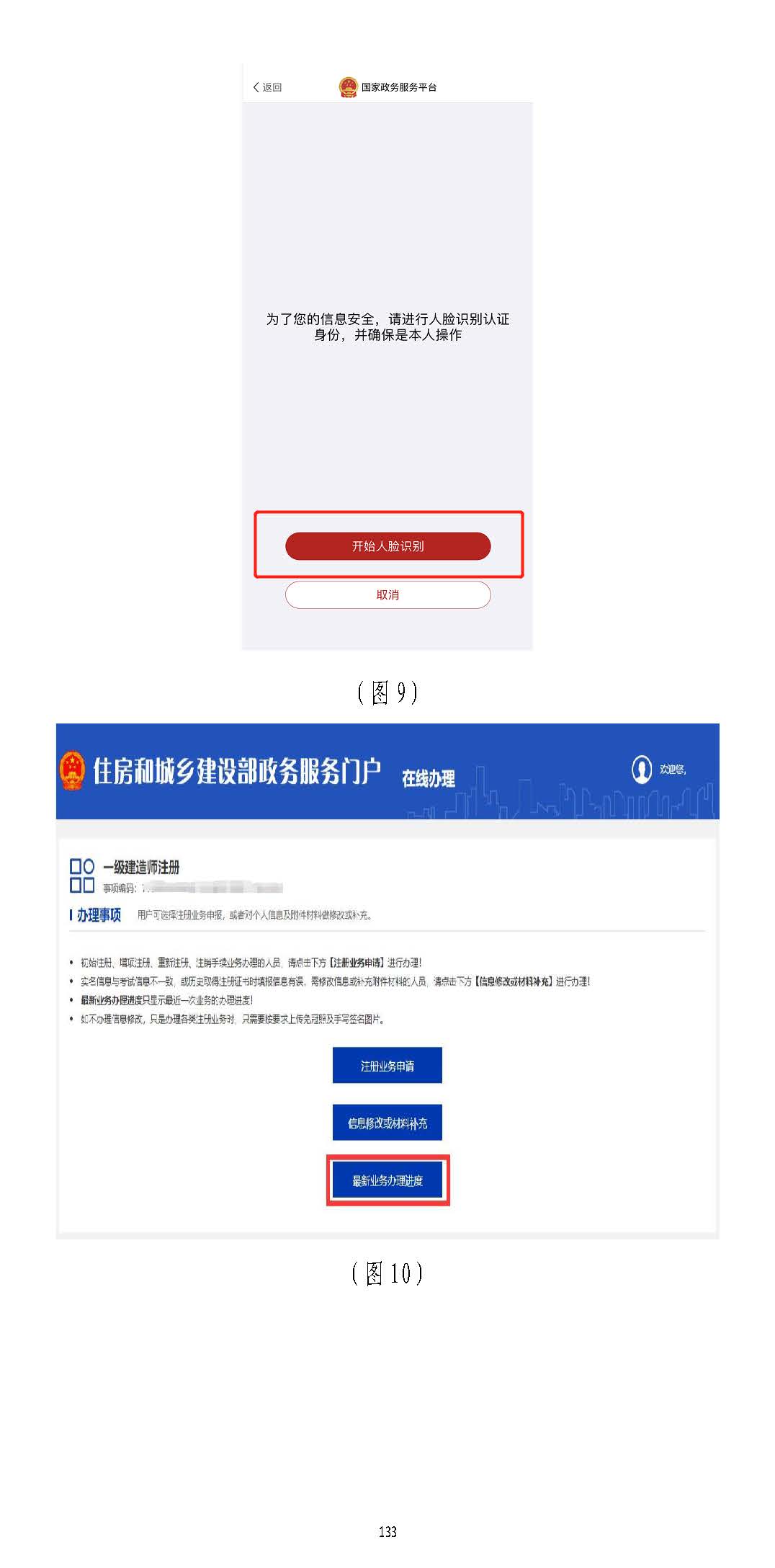 進入掃描識別頁面后(圖77),請先用手機掃描右側二維碼下載),請先用手機掃描右側二維碼下載“國家政務服務“國家政務服務平臺”平臺”APPAPP,登錄,登錄“國家政務服務平臺”“國家政務服務平臺”APPAPP,點擊,點擊APPAPP界面上方的掃描圖標(圖界面上方的掃描圖標(圖88),),掃描掃描(圖(圖77))頁面的左側二維碼頁面的左側二維碼((若左側二維碼未出現(xiàn),請重啟瀏覽器至此頁面若左側二維碼未出現(xiàn),請重啟瀏覽器至此頁面)),點,點擊擊“國家政務服務平臺”“國家政務服務平臺”APPAPP中的【開始人臉識別】按鈕(圖中的【開始人臉識別】按鈕(圖99),按要求進行人),按要求進行人臉識臉識別,識別無誤后,別,識別無誤后,APPAPP提示“實人認證成功”,提示“實人認證成功”,人臉識別認證成功后,在自動跳轉的人臉識別認證成功后,在自動跳轉的一級建造師注冊辦理事項頁面中一級建造師注冊辦理事項頁面中(若未自動跳轉,(若未自動跳轉,請點擊“手動跳轉”或請點擊“手動跳轉”或重啟瀏覽器重啟瀏覽器至此頁面)至此頁面),,點擊點擊點擊【最新業(yè)務辦理進度】按鈕點擊【最新業(yè)務辦理進度】按鈕(圖(圖1010),進入),進入一級建造師執(zhí)業(yè)資一級建造師執(zhí)業(yè)資格認定進度查詢頁面格認定進度查詢頁面(圖(圖1111))。。
