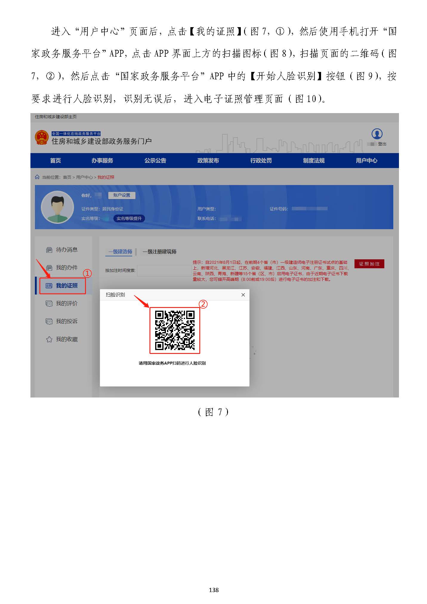 第二步:點擊【點擊【查看詳情查看詳情】】按鈕按鈕后,后,打開手機打開手機“國家政務服務平臺”“國家政務服務平臺”APPAPP,點擊,點擊APPAPP界面上方的掃描圖標(圖界面上方的掃描圖標(圖66),掃描),掃描彈彈窗窗頁面頁面左側二維碼(圖左側二維碼(圖55,③),點擊,③),點擊APPAPP界界面中面中【開始人臉識別】按鈕(圖【開始人臉識別】按鈕(圖77),按要求進行人臉識別,識別無誤后,),按要求進行人臉識別,識別無誤后,APPAPP提示“實提示“實人認證成功”,進入一級注冊建造師電子證照詳情頁面(圖人認證成功”,進入一級注冊建造師電子證照詳情頁面(圖88););