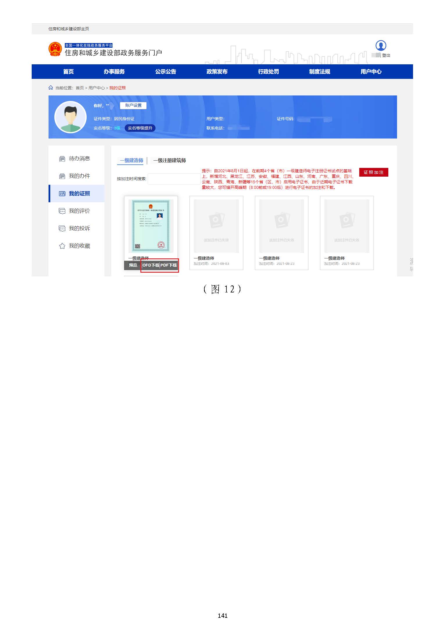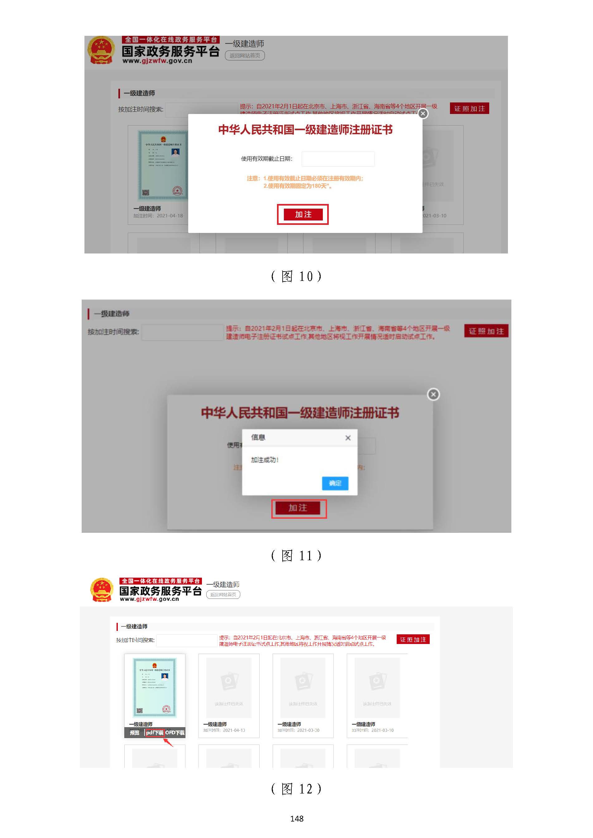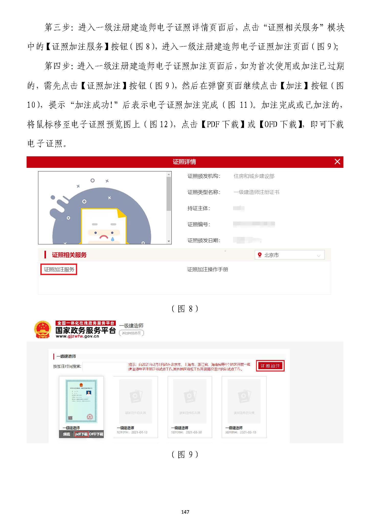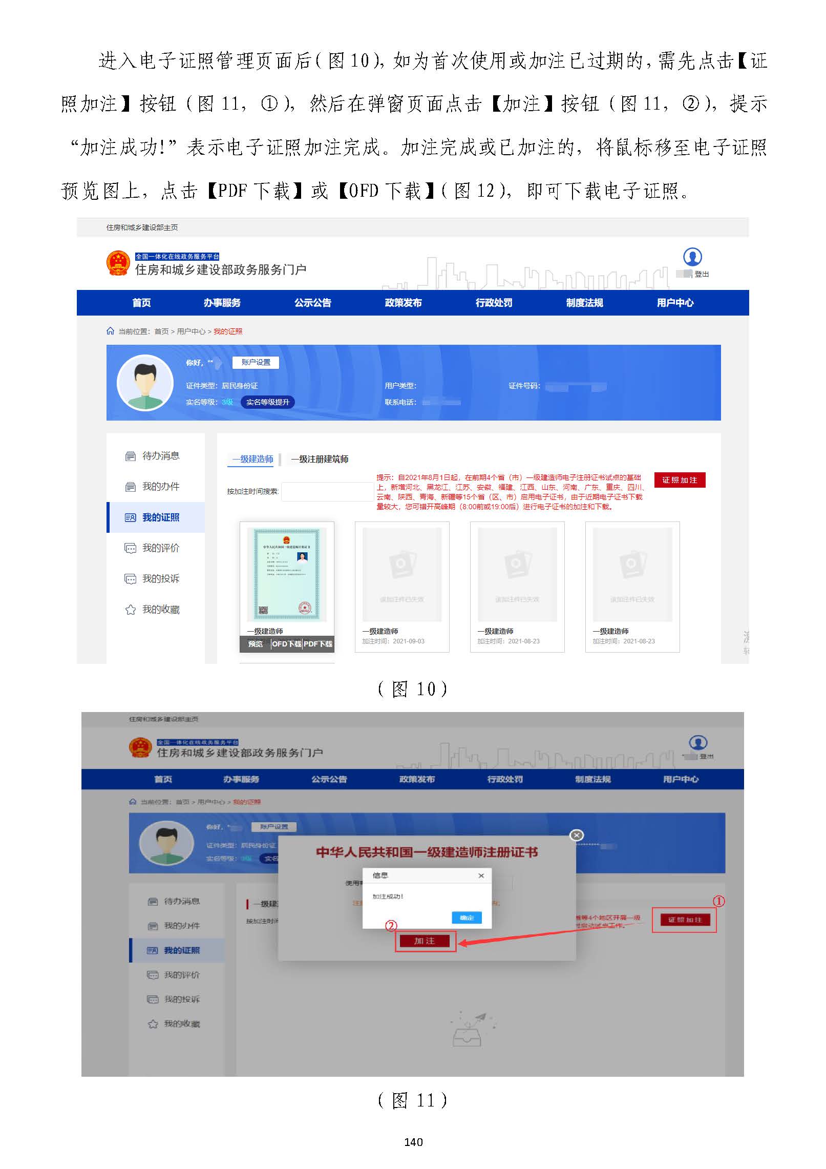 第四步:步:進入一級注冊建造師電子證照加注頁面后,進入一級注冊建造師電子證照加注頁面后,如為如為首次使用或加注已過期首次使用或加注已過期的的,,需先需先點擊點擊【【證照加注證照加注】】按鈕按鈕(圖(圖99),然后),然后在彈窗頁面繼續(xù)點擊在彈窗頁面繼續(xù)點擊【【加注加注】】按鈕按鈕(圖(圖1100)),提示“加注成功!”,提示“加注成功!”后后表示電子證照加注完成表示電子證照加注完成(圖(圖1111))。。加注完成或已加注的加注完成或已加注的,,將鼠標移至電子證照預覽圖上(圖將鼠標移至電子證照預覽圖上(圖1122)),點擊,點擊【【PDFPDF下載下載】】或或【【OFDOFD下載下載】】,,即可下載即可下載電子證照電子證照。。