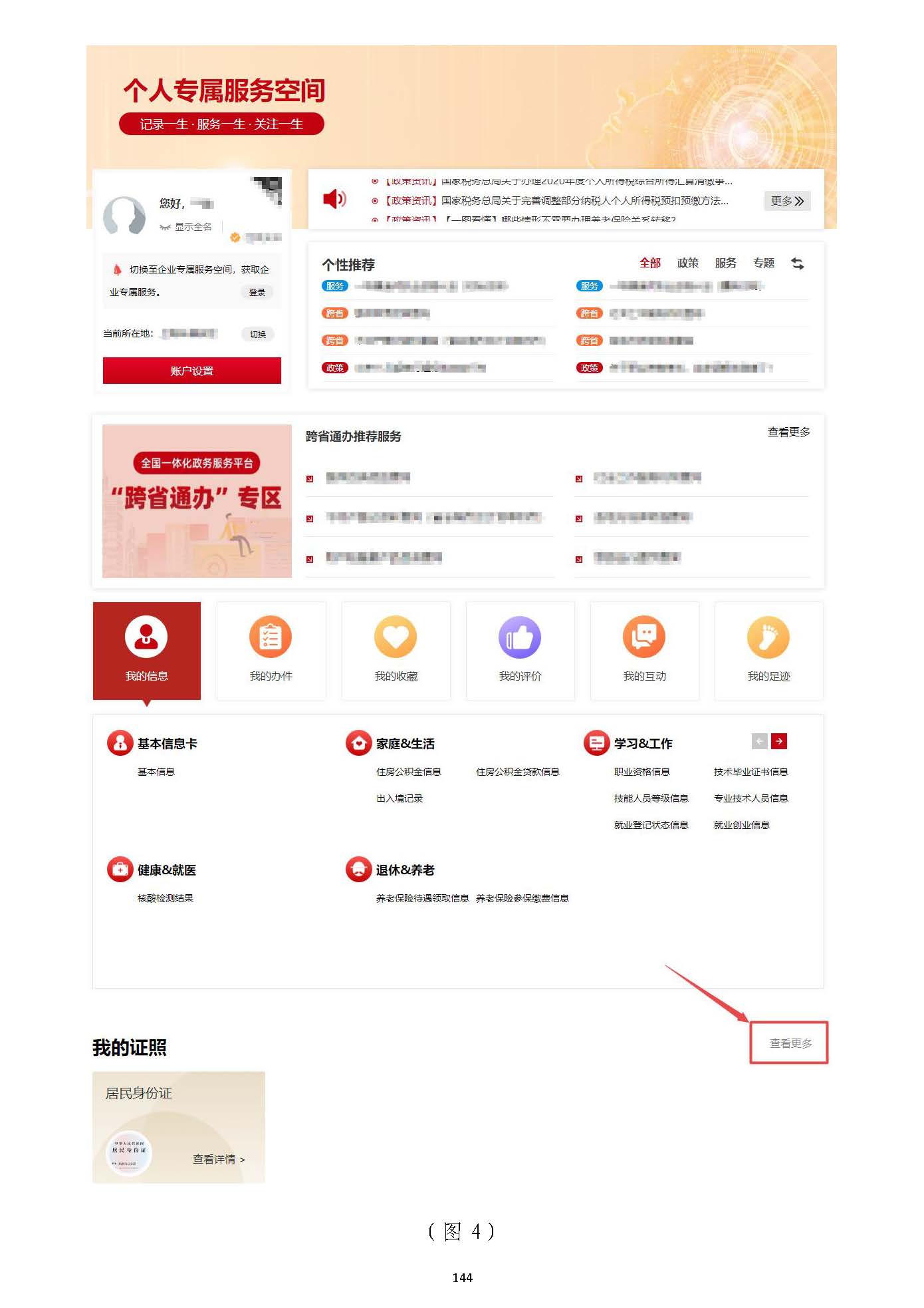 進入用戶中心頁面后,后,點擊瀏覽器右側下拉進度條,拖動至點擊瀏覽器右側下拉進度條,拖動至““我的證照我的證照”模塊。”模塊。點擊點擊【【查看更多查看更多】】按鈕按鈕(圖(圖44),進入我的證照管理頁面(圖),進入我的證照管理頁面(圖55)。)。