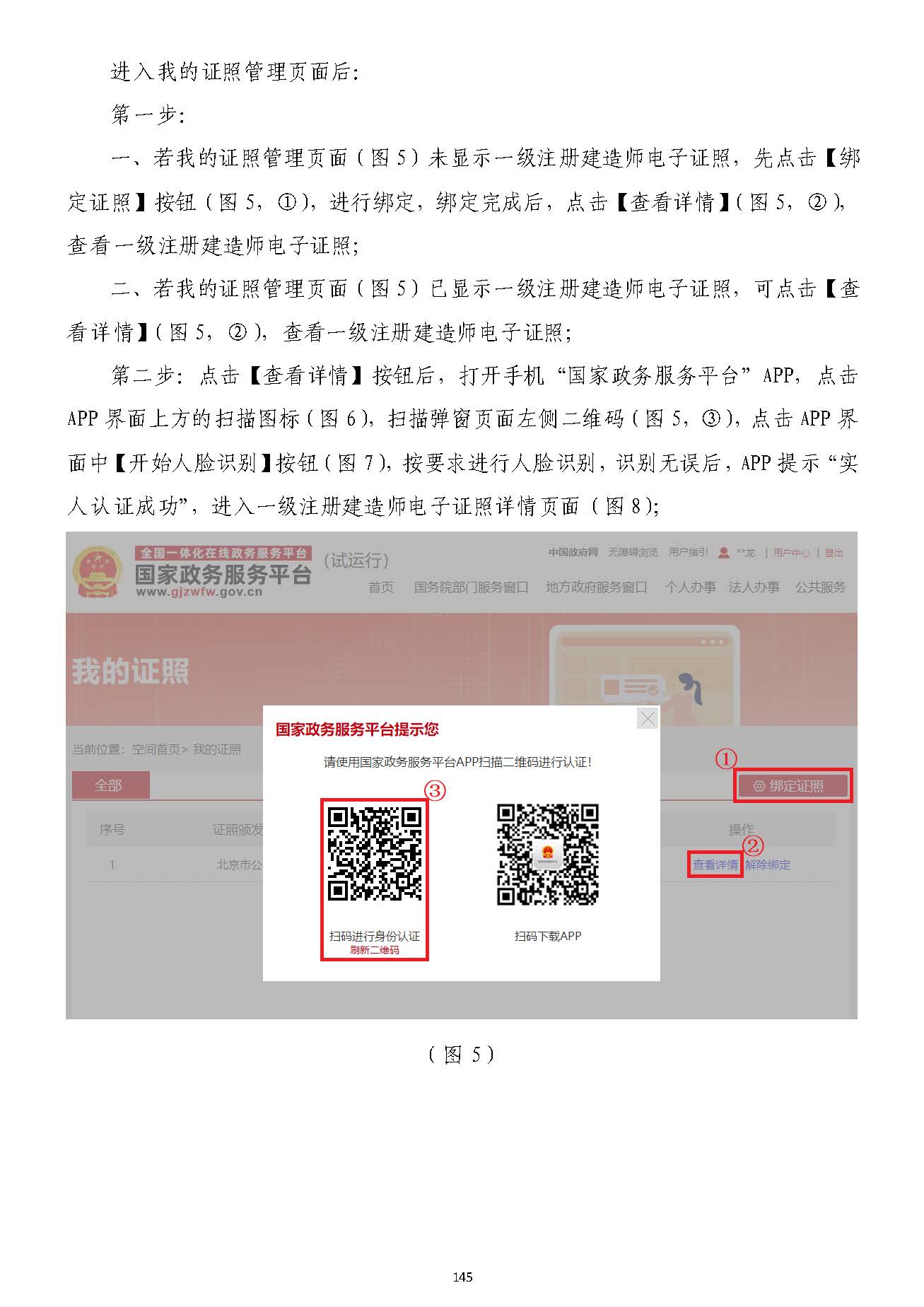 一、、若若我的證照管理我的證照管理頁面頁面(圖(圖55))未未顯示顯示一級注冊建造師一級注冊建造師電子證照電子證照,,先先點擊【點擊【綁綁定證照定證照】】按鈕按鈕(圖(圖55,,①①)),,進行進行綁定,綁定完成后,點擊【綁定,綁定完成后,點擊【查看詳情查看詳情】(圖】(圖55,,②②),),查看一級注冊建造師電子證照查看一級注冊建造師電子證照;;