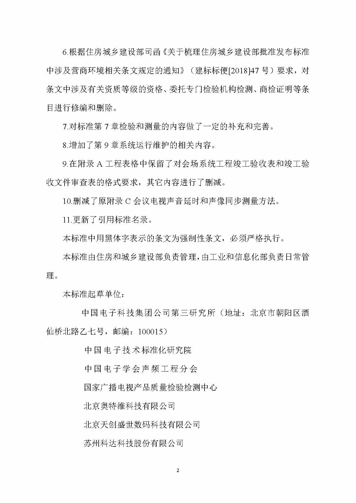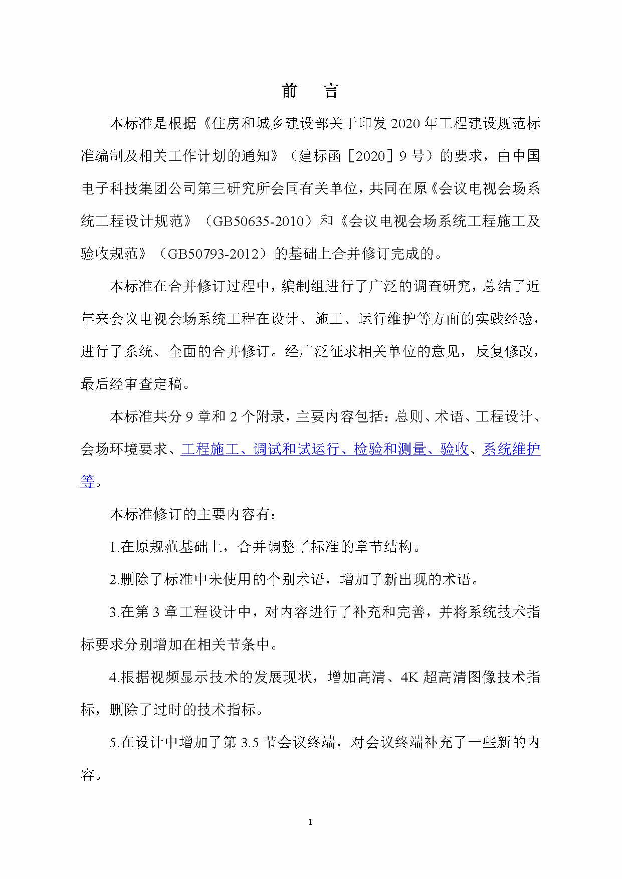 本標準共分9章和2個附錄,主要內容包括:總則、術語、工程設計、會場環境要求、工程施工、調試和試運行、檢驗和測量、驗收、系統維護等。